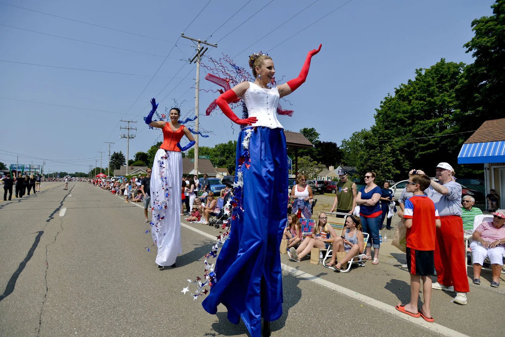 Kaitlyn Grimes, 26, of Erie, Pa., left, and Carrie Bach, 37, of Millcreek Township, Pa., walk on stilts during Millcreek's 50th annual Fourth of July parade in Millcreek Township, Pa., Saturday, July 4, 2015. (Photo by Sarah Crosby/Erie Times-News via AP Photo)