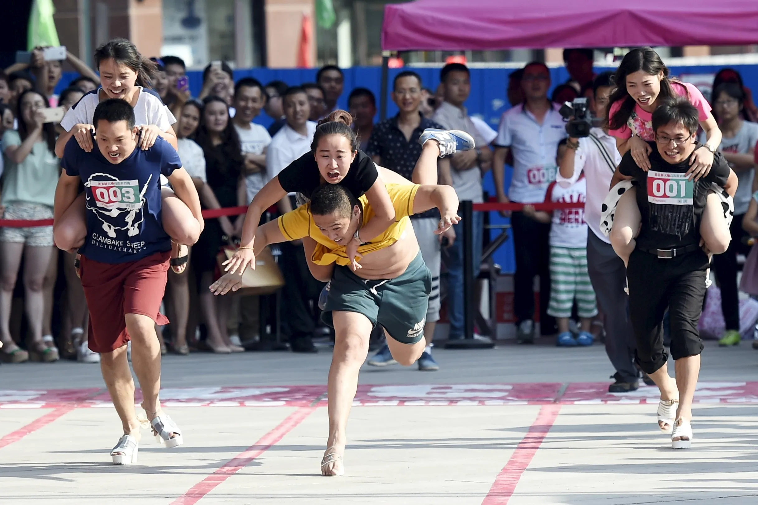 A couple fall as they take part in a high-heels race in Taiyuan, Shanxi province, China, July 3, 2015. The winning couple won a diamond ring after the 50 meter race, according to local media. (Photo by Reuters/Stringer)