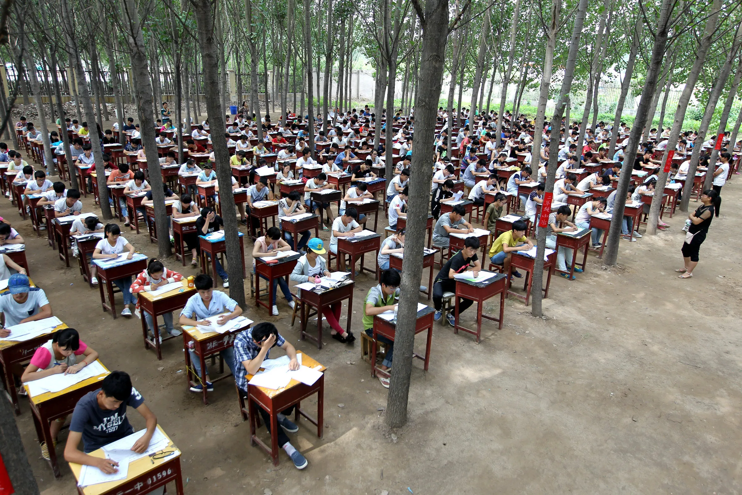 More than 800 students of grade two take part in the end-of-term exam in poplar woods at Fengqiu No.1 High School on July 3, 2015 in Fengqiu County, China. The schoolmaster said that most students often read books in the woods, it's a relaxing place and can relieve students' strain. (Photo by ChinaFotoPress/ChinaFotoPress via Getty Images)