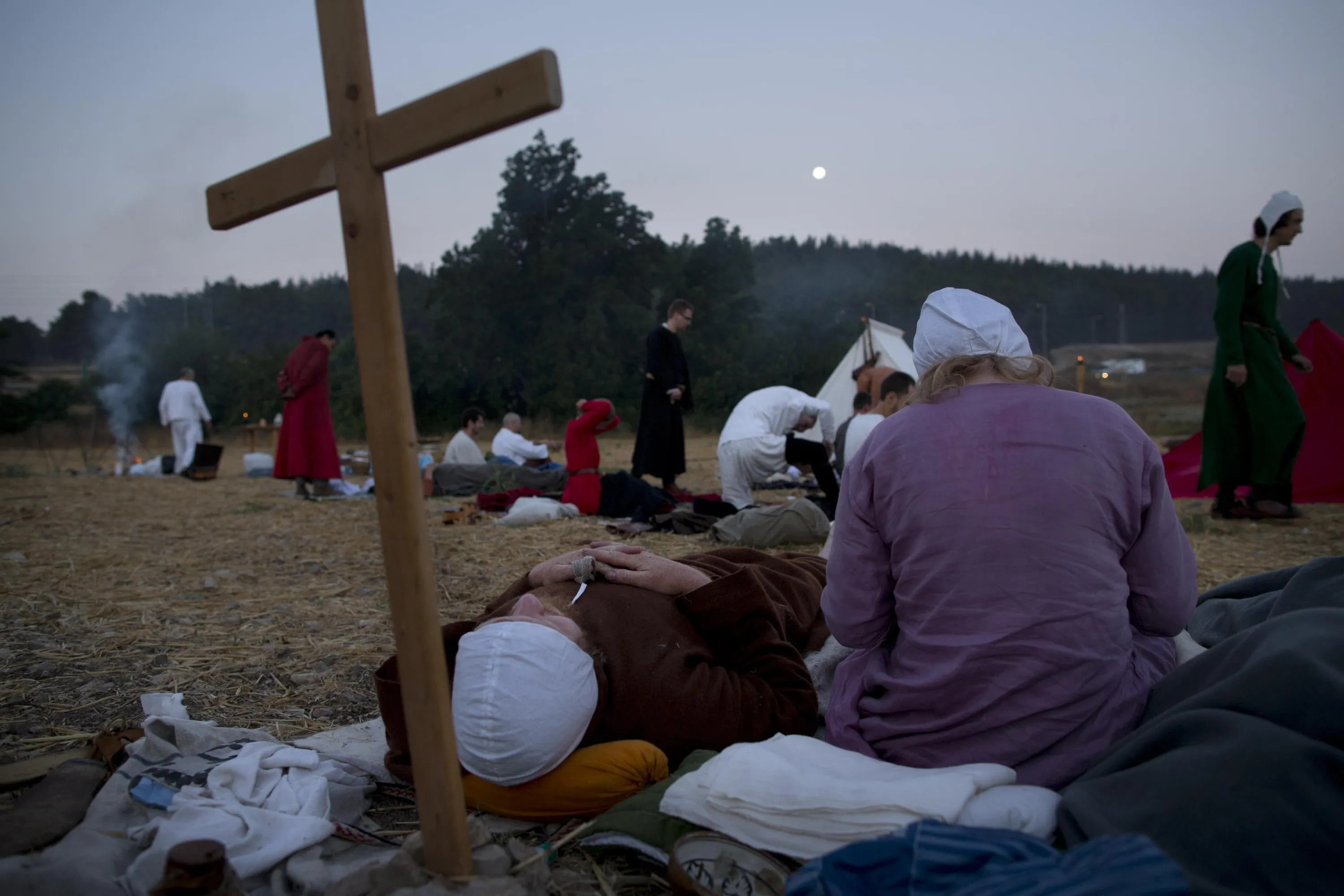In this Thursday, July 2, 2015 photo, Israeli and Russian members of knight clubs wearing medieval costumes wait in their camp before marching 27 kilometers (17 miles) to the reenactment of the Battle of Hattin from the ancient northern city of Zippori to Horns of Hattin, northern Israel. (Photo by Oded Balilty/AP Photo)