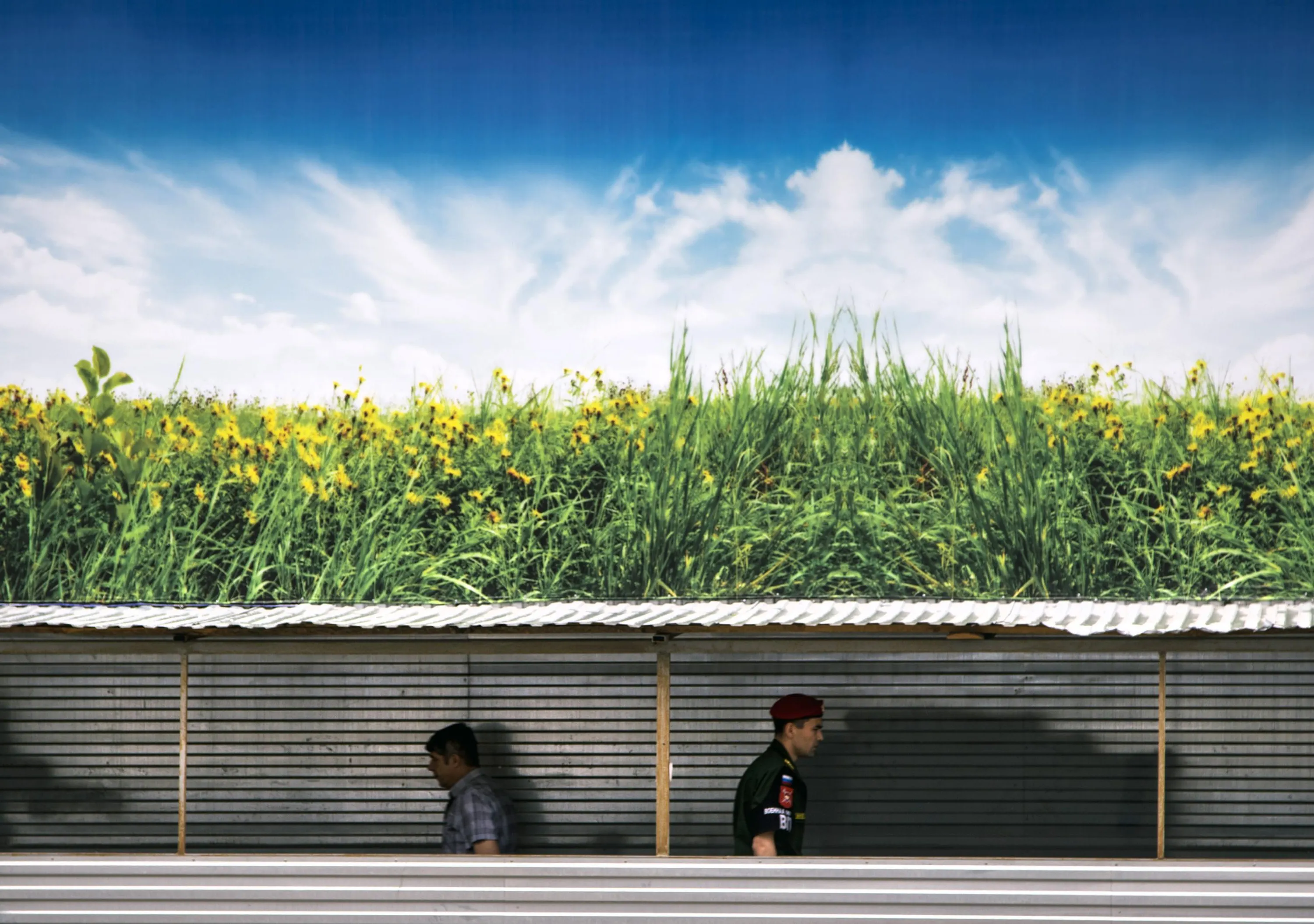 In this photo taken on Sunday, July 5, 2015, people walk past a giant poster, top to give an improved appearance, in downtown Ufa, Russia. (Photo by Vadim Braydov/AP Photo)