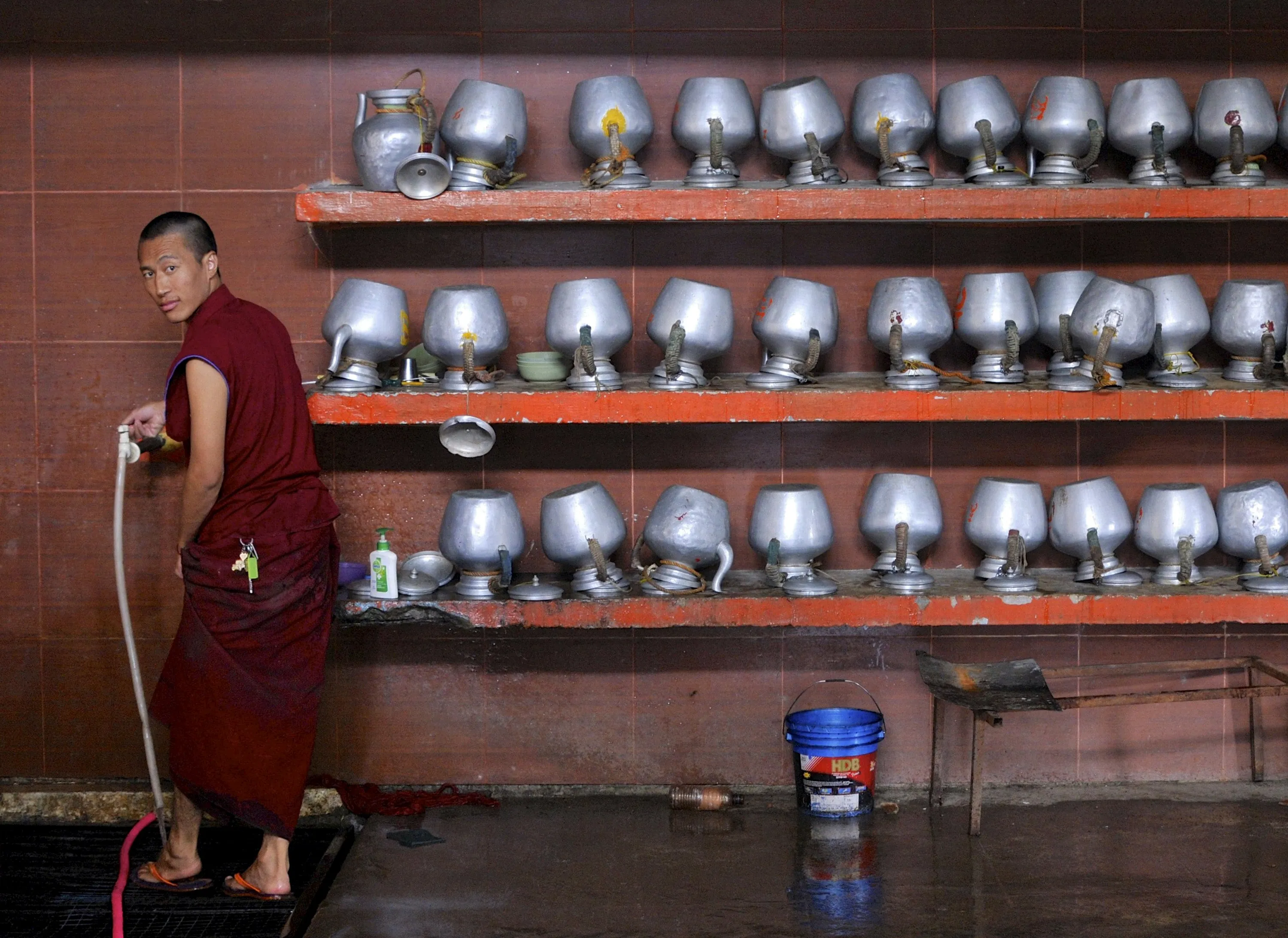 A Tibetan monk washes his feet in a community kitchen during celebrations to mark the 80th birthday of the Tibetan spiritual leader, the Dalai Lama, at the Sera Jey Monastery in Bylakuppe in the southern state of Karnataka, India, July 6, 2015. (Photo by Abhishek N. Chinnappa/Reuters)