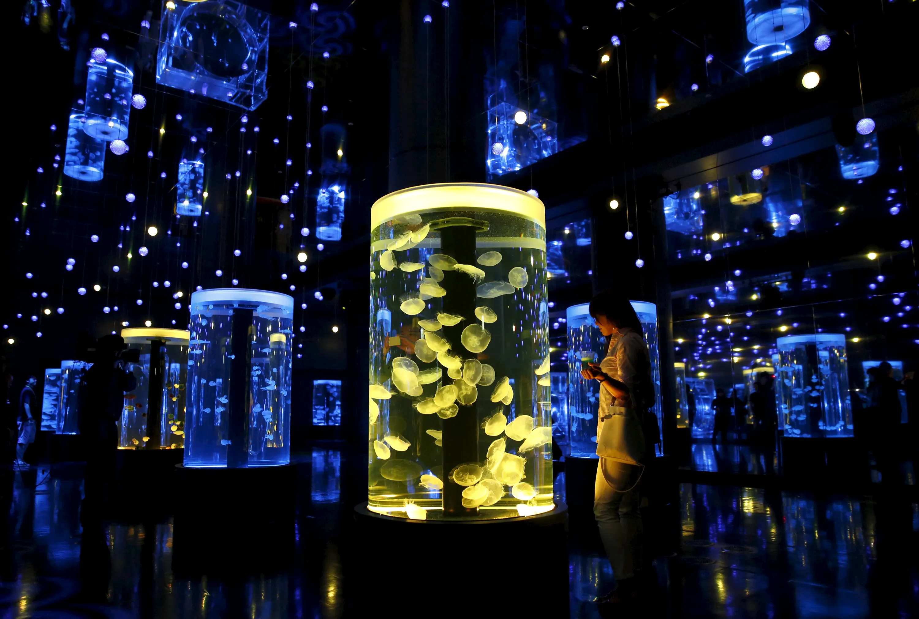 A woman looks at jellyfish during a media preview for the Epson Aqua Park Shinagawa aquarium's re-opening in Tokyo, July 6, 2015. (Photo by Toru Hanai/Reuters)