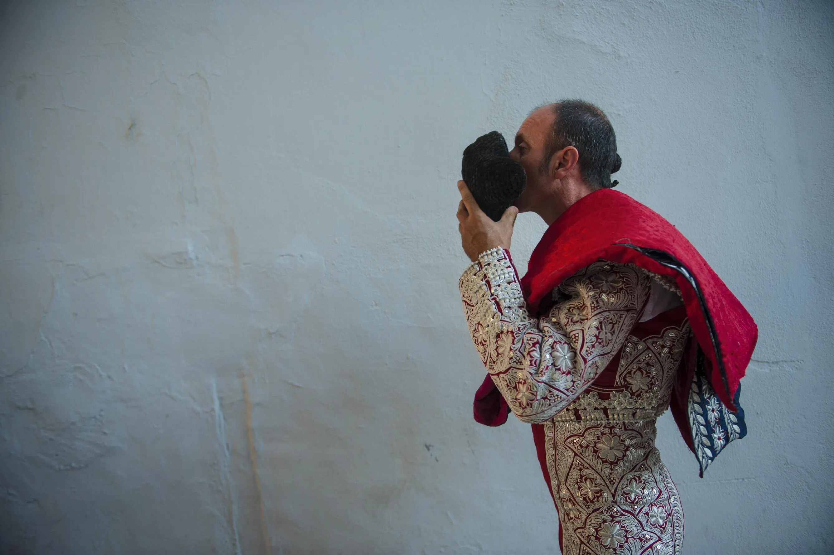 An assistant to a Spanish mounted bullfighter waits on the sidelines during a horseback bullfight at San Fermin Fiestas, in Pamplona, northern Spain, Monday, July 6, 2015. Revelers from around the world kick off the festival with a messy party in the Pamplona town square, one day before the first of eight days of the running of the bulls. (Photo by Alvaro Barrientos/AP Photo)