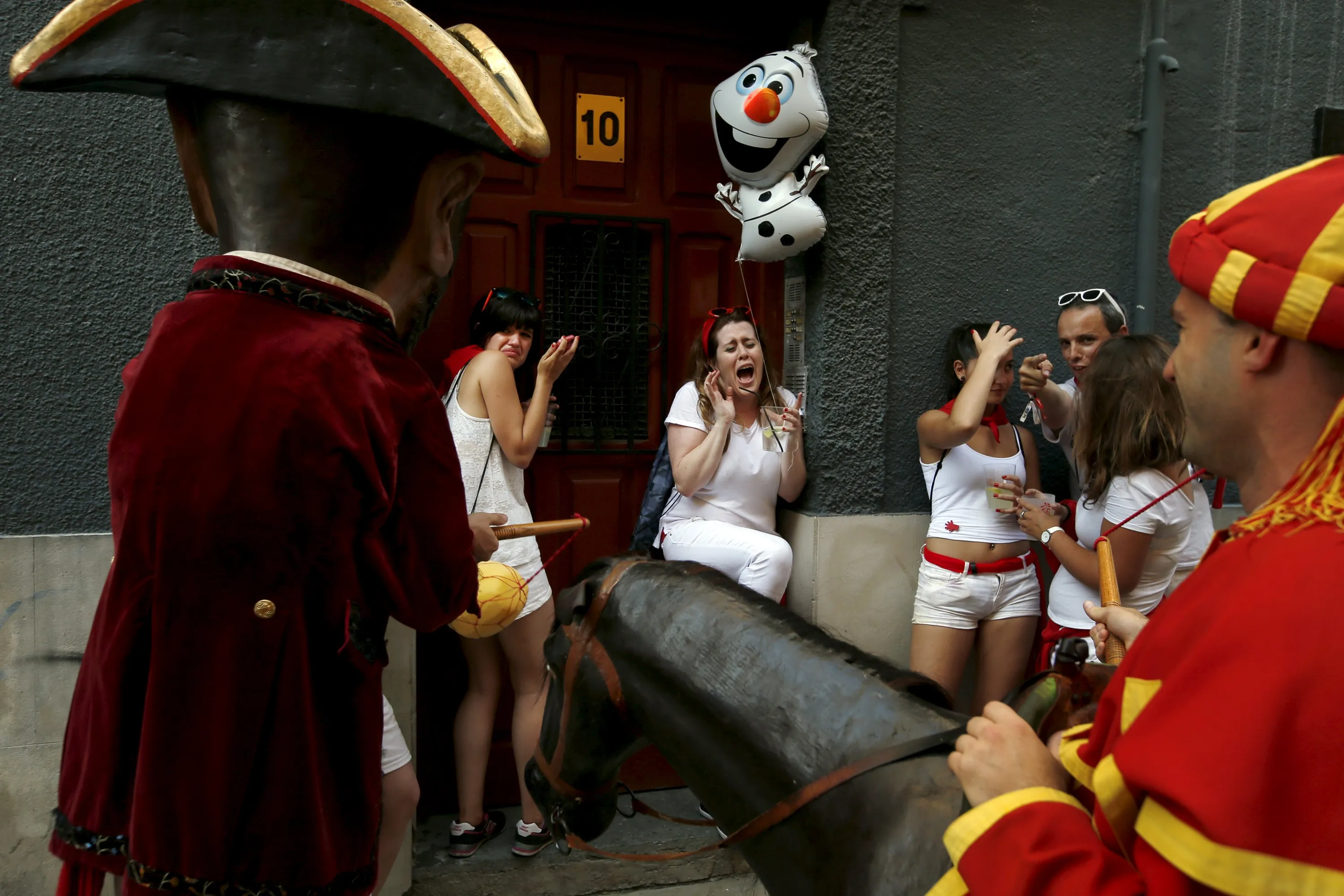 Women react before being hit with a sponge by a Kiliki (L) during San Fermin festival's “Comparsa de gigantes y cabezudos” (Parade of Giants and Big Heads) in Pamplona, northern Spain, July 6, 2015. “Kilikis”, wearing oversized masks as they playfully hit bystanders with sponges on sticks, parade daily through the city accompanied by brass bands during the nine-day-long festival made popular by U.S. writer Ernest Hemingway. (Photo by Susana Vera/Reuters)