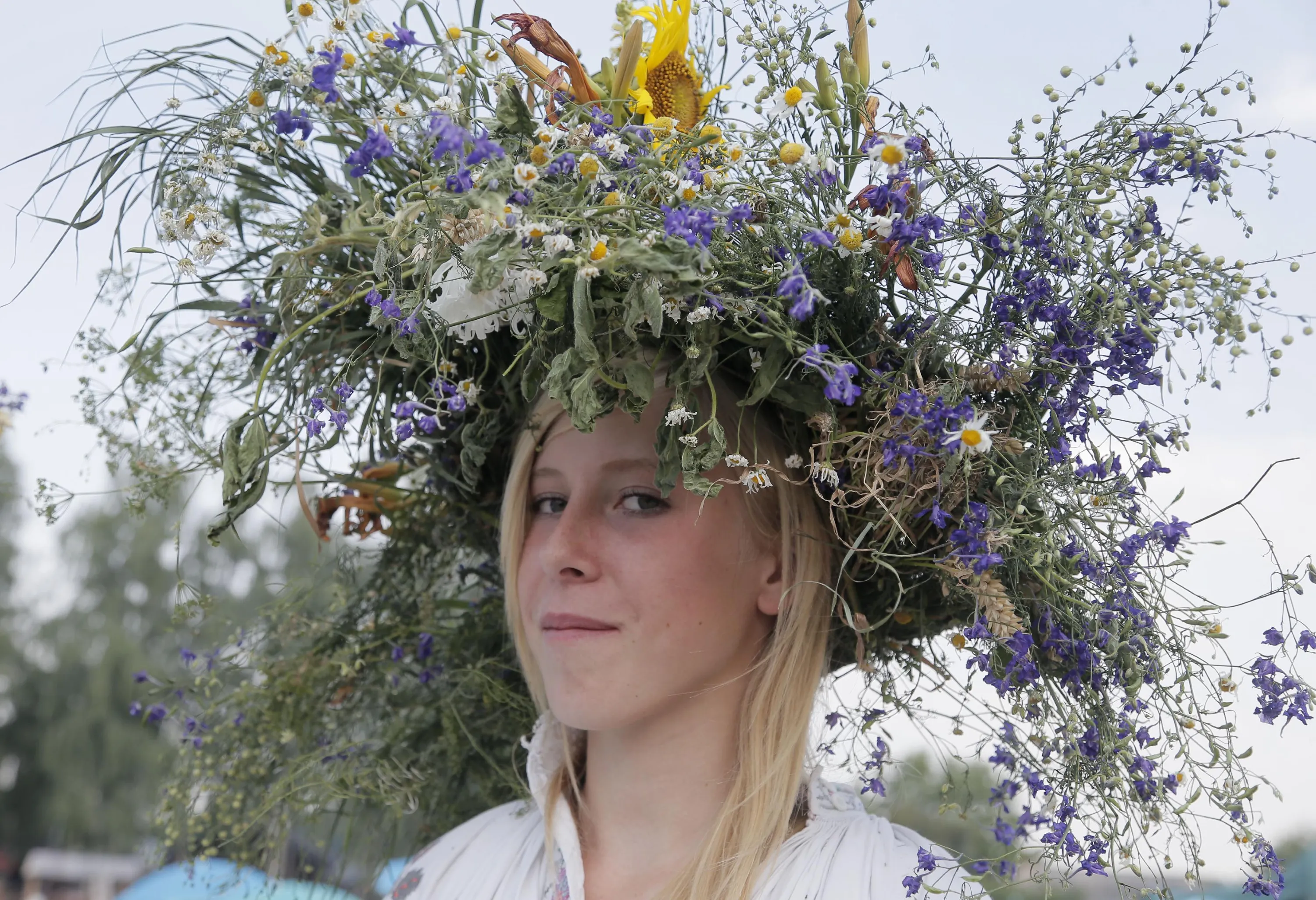 A girl with a ritual garland on her head poses for a photograph during a traditional Midsummer Night celebration, near the capital Kiev, Ukraine, Monday, July 6, 2015. (Photo by Efrem Lukatsky/AP Photo)