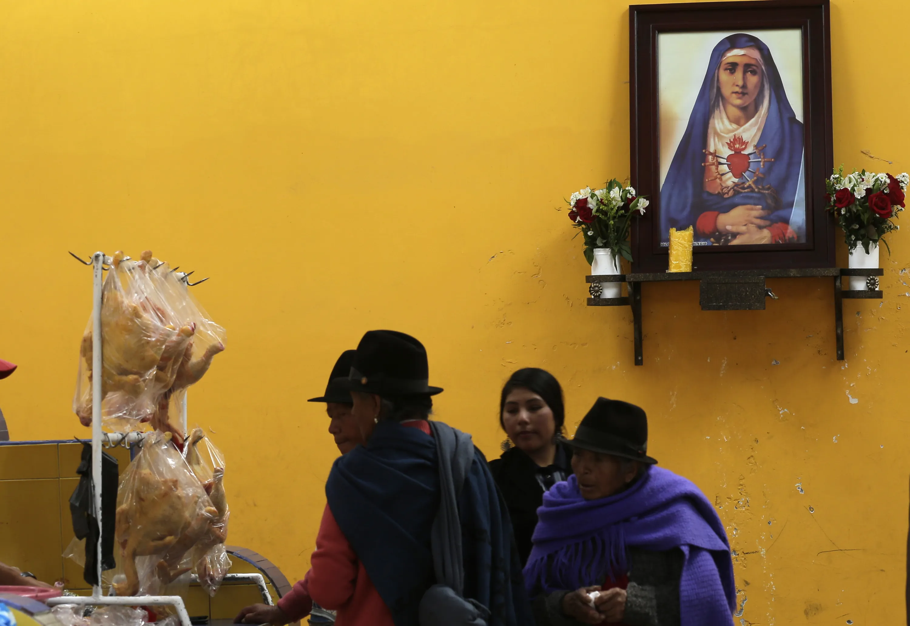 In this June 7, 2015 photo, women walk past an altar dedicated to Our Lady of Sorrows, as they enter a market in Pujili, Ecuador. (Photo by Dolores Ochoa/AP Photo)