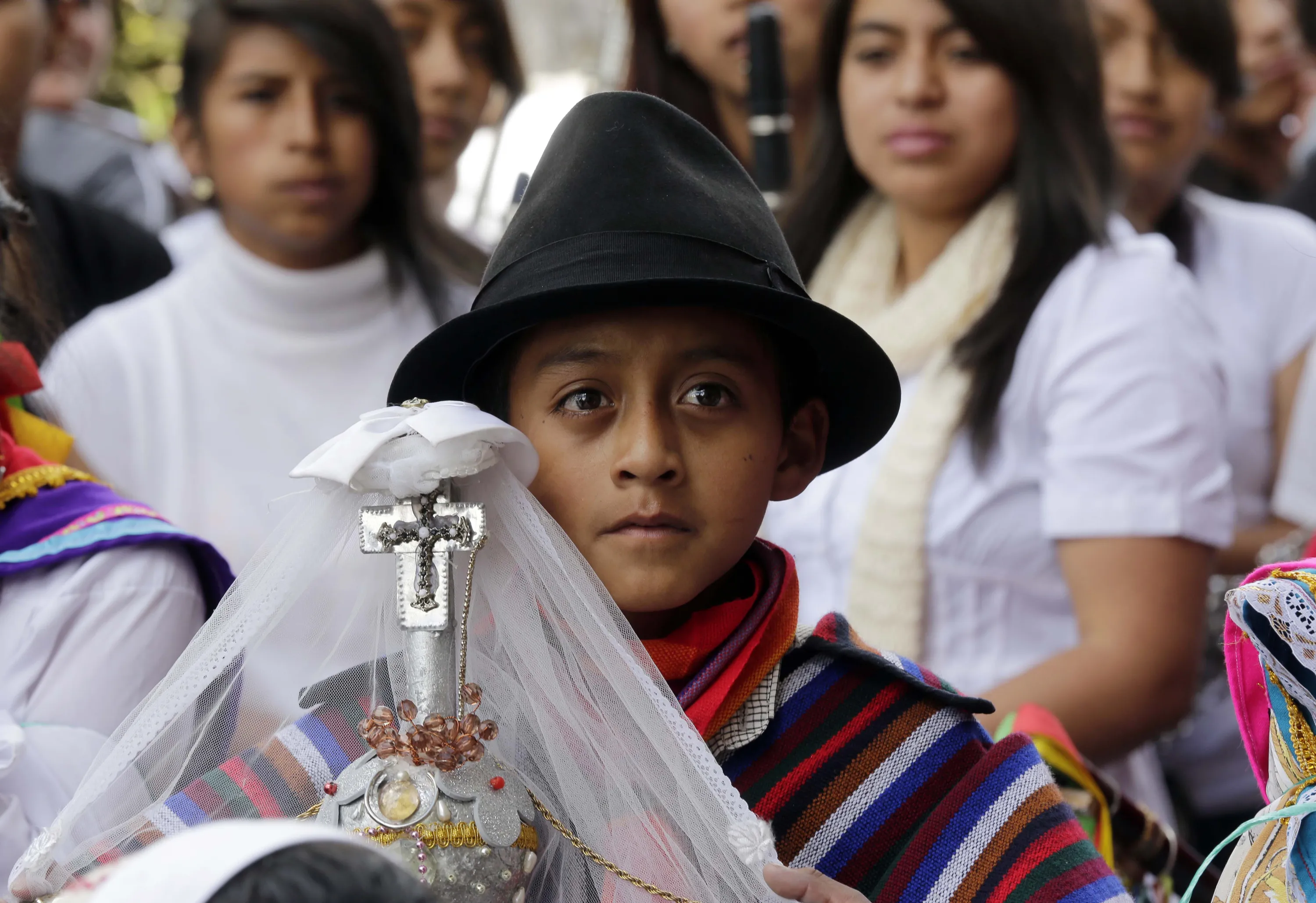 In this June 4, 2015 photo, a boy representing a steward or prioste, carrying a staff or guion, takes part in a Corpus Christi festival, in Pujili, Ecuador. (Photo by Dolores Ochoa/AP Photo)