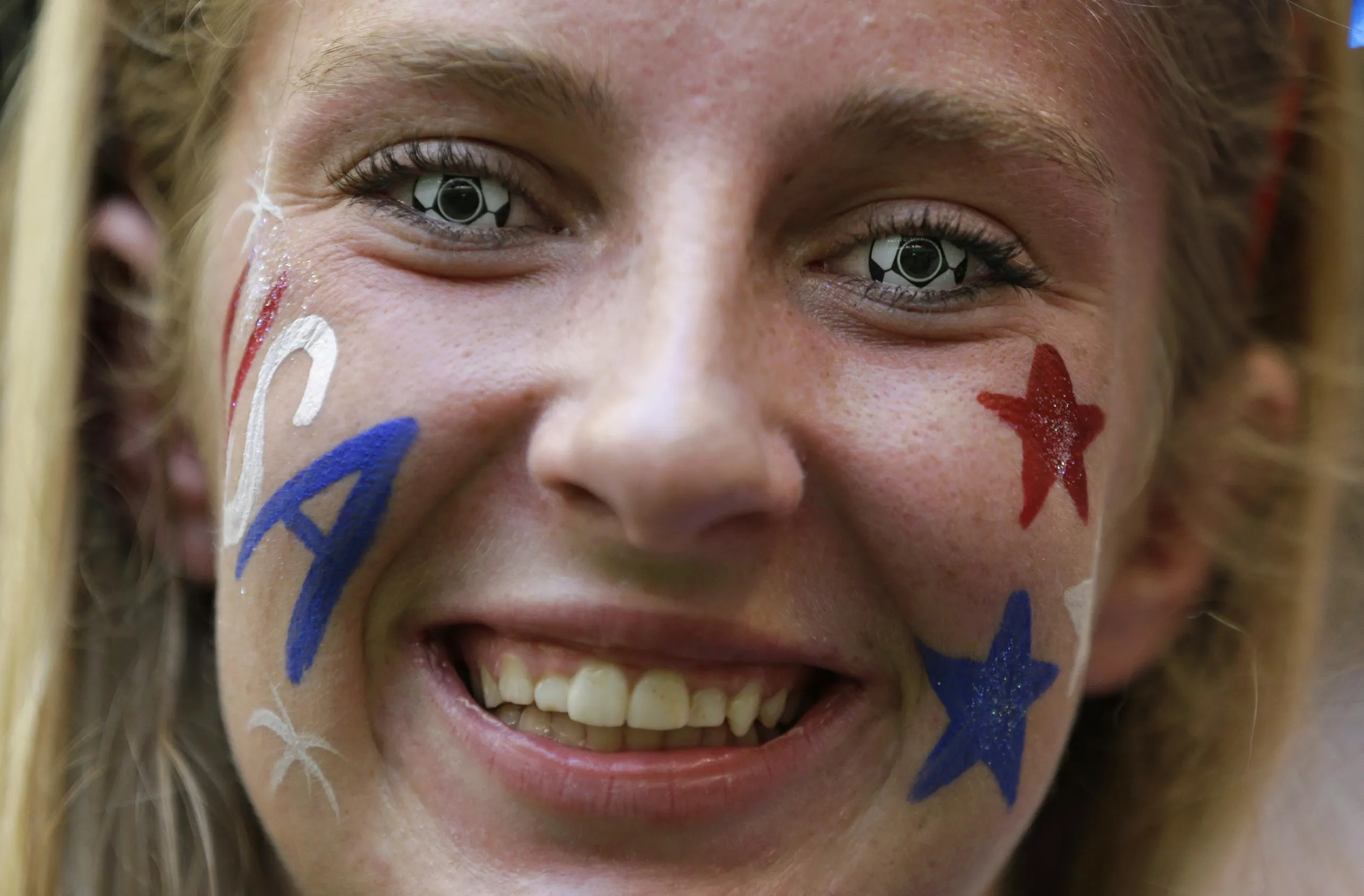Krista McMahan, of St. Louis, wears soccer ball contact lenses as she cheers before the FIFA Women's World Cup soccer championship final between the United States and Japan in Vancouver, British Columbia, Canada, Sunday, July 5, 2015. (Photo by Elaine Thompson/AP Photo)
