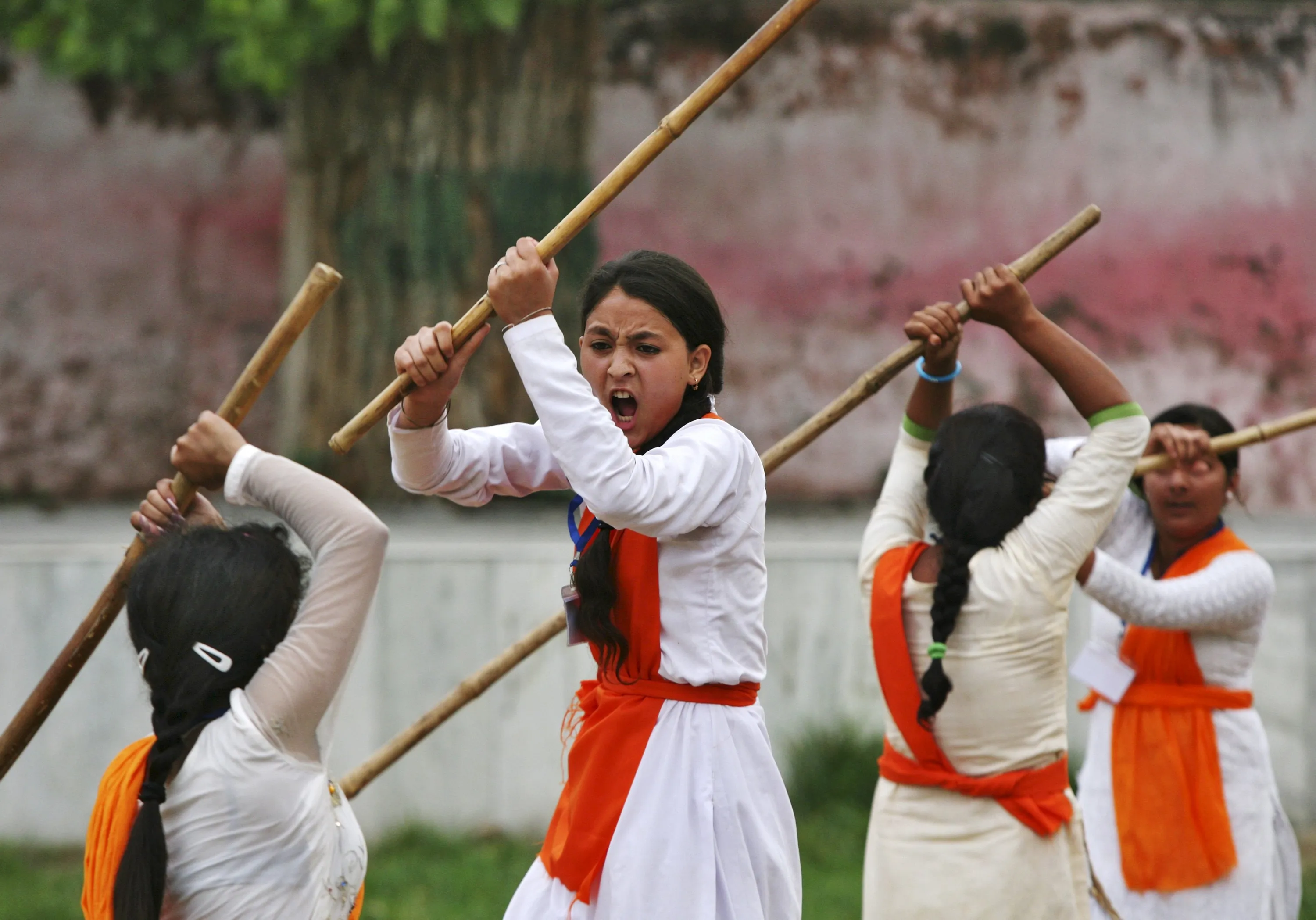 School girls wield bamboo sticks during an event held to demonstrate self-defence skills as part of a camp organized by the Vishwa Hindu Parishad (VHP), a Hindu group, in Jammu July 7, 2015. (Photo by Mukesh Gupta/Reuters)