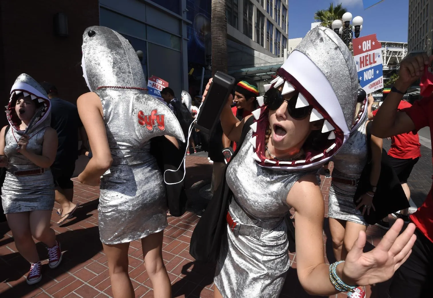 Women promoting “Sharknado 3” dance on Fifth Avenue on Preview Night at the 2015 Comic-Con International held at the San Diego Convention Center Wednesday, July 8, 2015, in San Diego. (Photo by Denis Poroy/Invision/AP Photo)