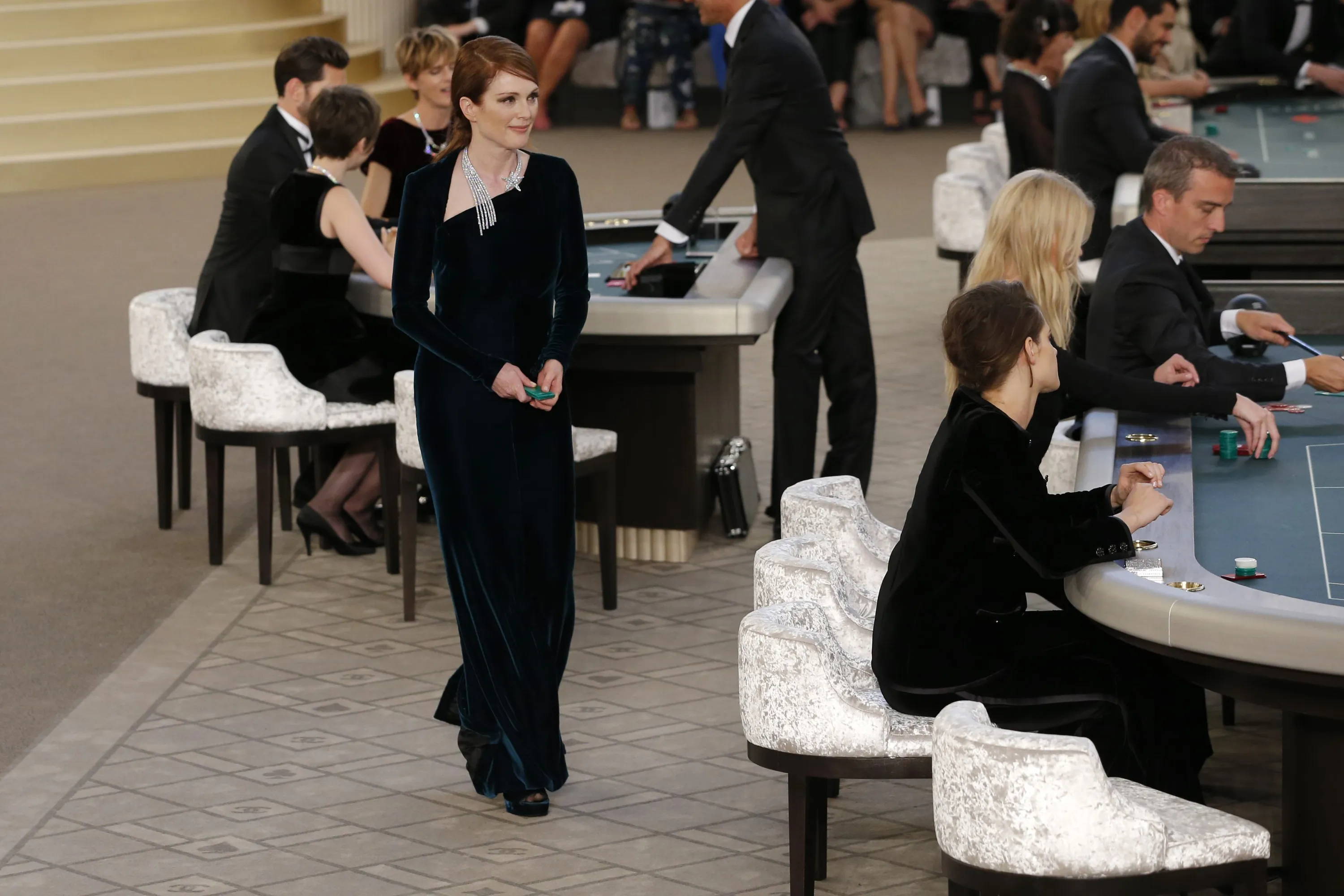 Actress Julianne Moore presents a creation by German designer Karl Lagerfeld as part of his Haute Couture Fall Winter 2015/2016 fashion show for French fashion house Chanel at the Grand Palais which is transformed into a casino in Paris, France, July 7, 2015. (Photo by Stephane Mahe/Reuters)