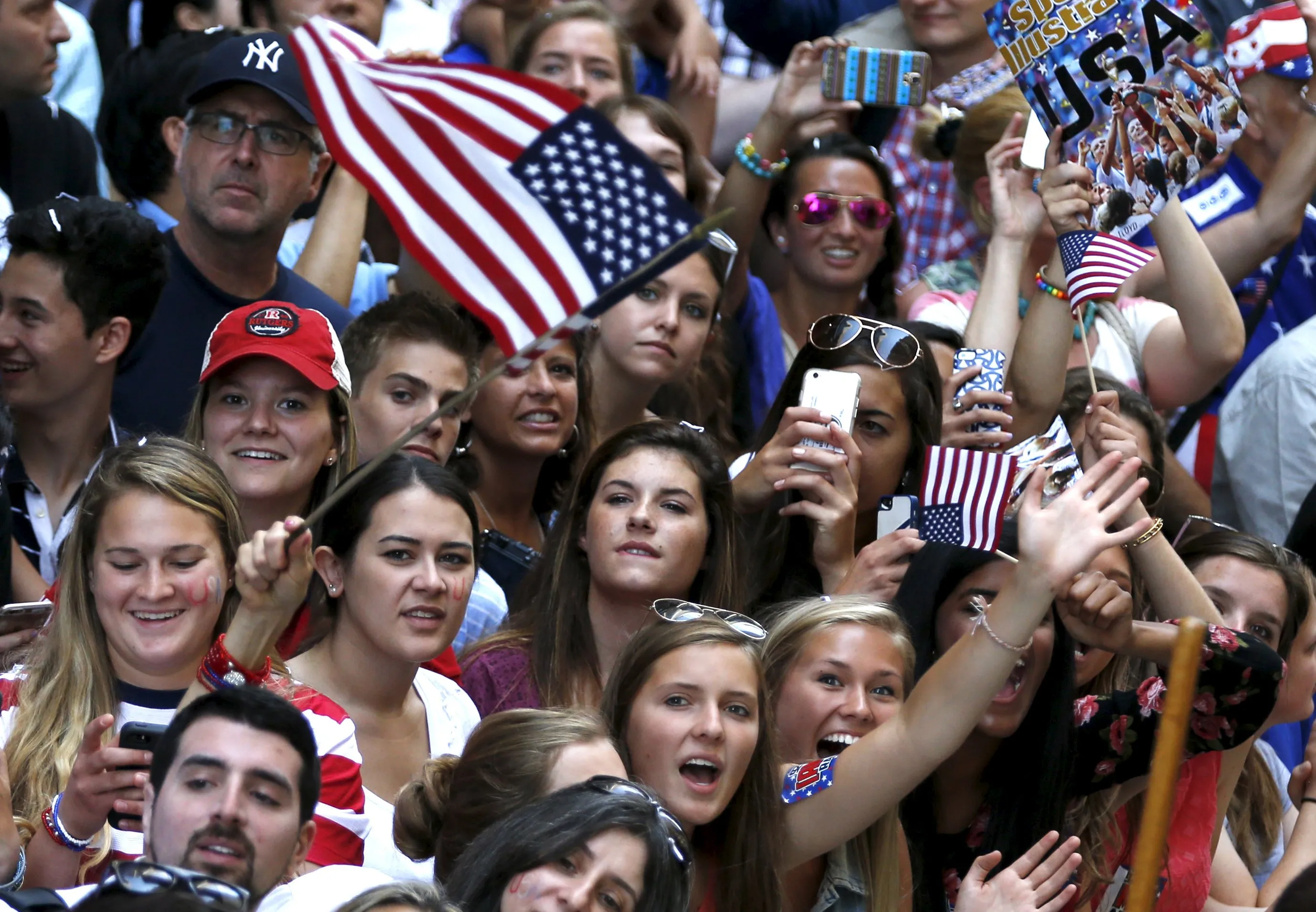 Fans pack the sidewalks to view the U.S. women's soccer team riding in floats during the ticker tape parade up Broadway in lower Manhattan to celebrate their World Cup final win over Japan in New York, July 10, 2015. (Photo by Mike Segar/Reuters)