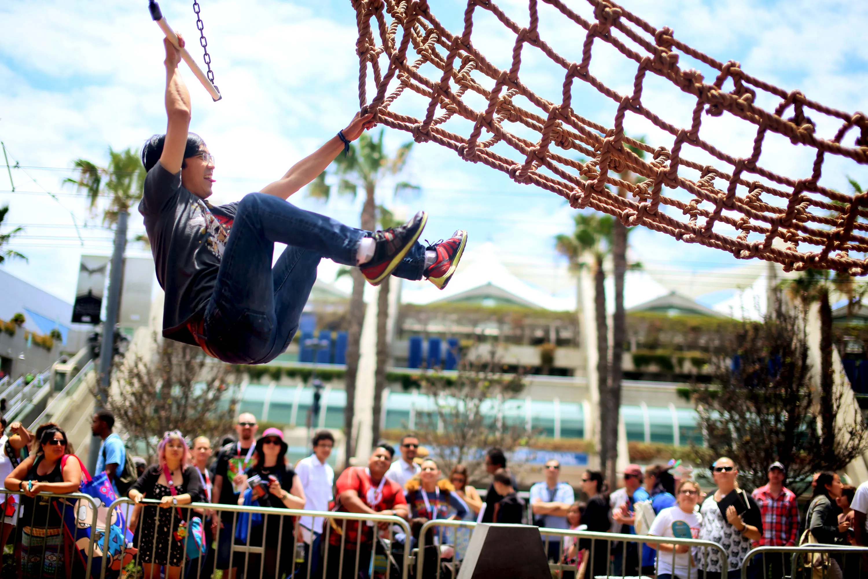 Carlin Stella grabs onto netting while doing an obstacle course at the “Assassins Creed Syndicate” booth outside of the 2015 Comic-Con International in San Diego, California July 10, 2015. (Photo by Sandy Huffaker/Reuters)