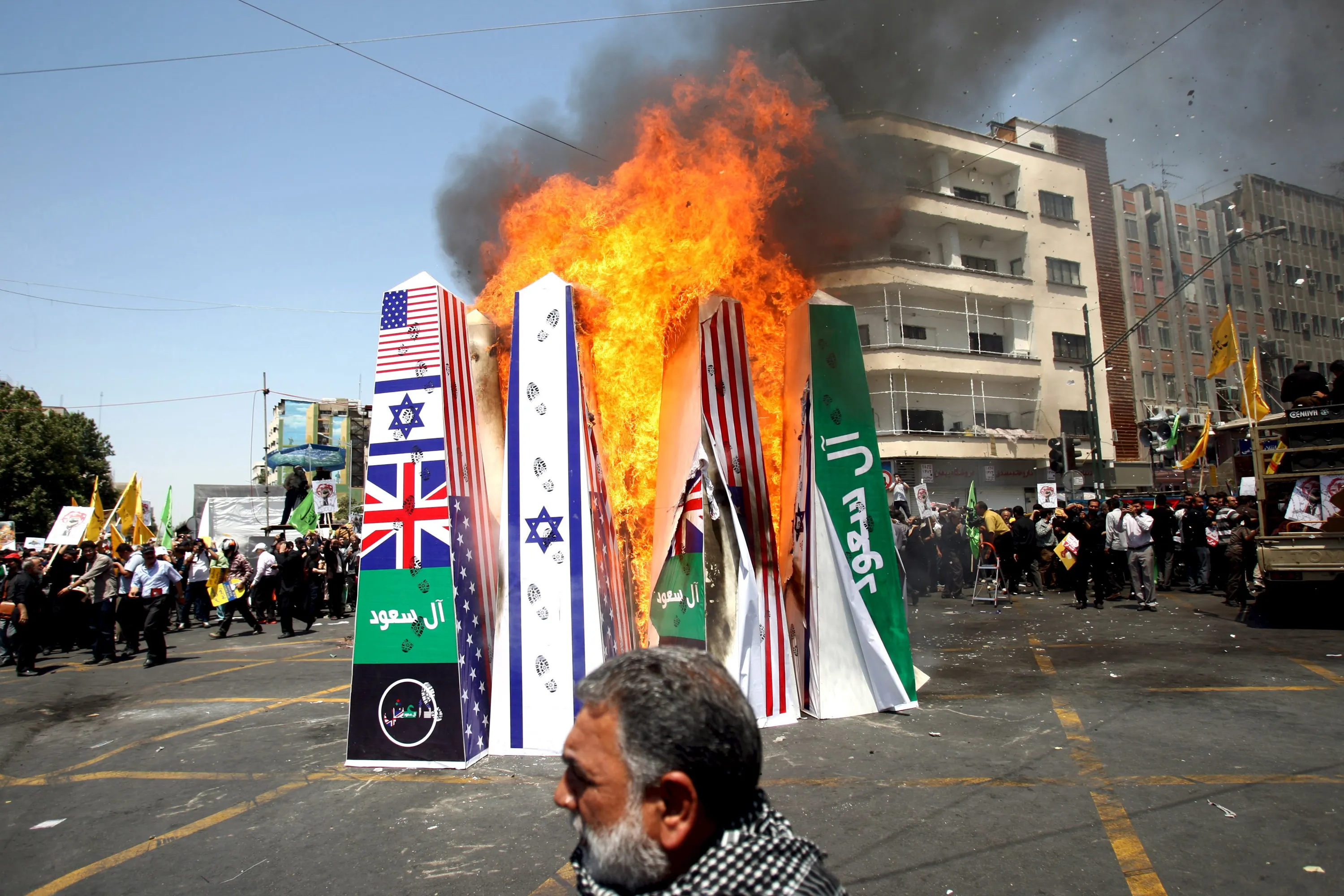 Iranian demonstrators burn symbolic structures depicting the flags of the U.S., Britain, and Israel during a rally marking al-Quds (Jerusalem) Day in Tehran July 10, 2015. The green banner reads, “Saud family”, referring to the royal family of Saudi Arabia. (Photo by Reuters/Stringer/TIMA)