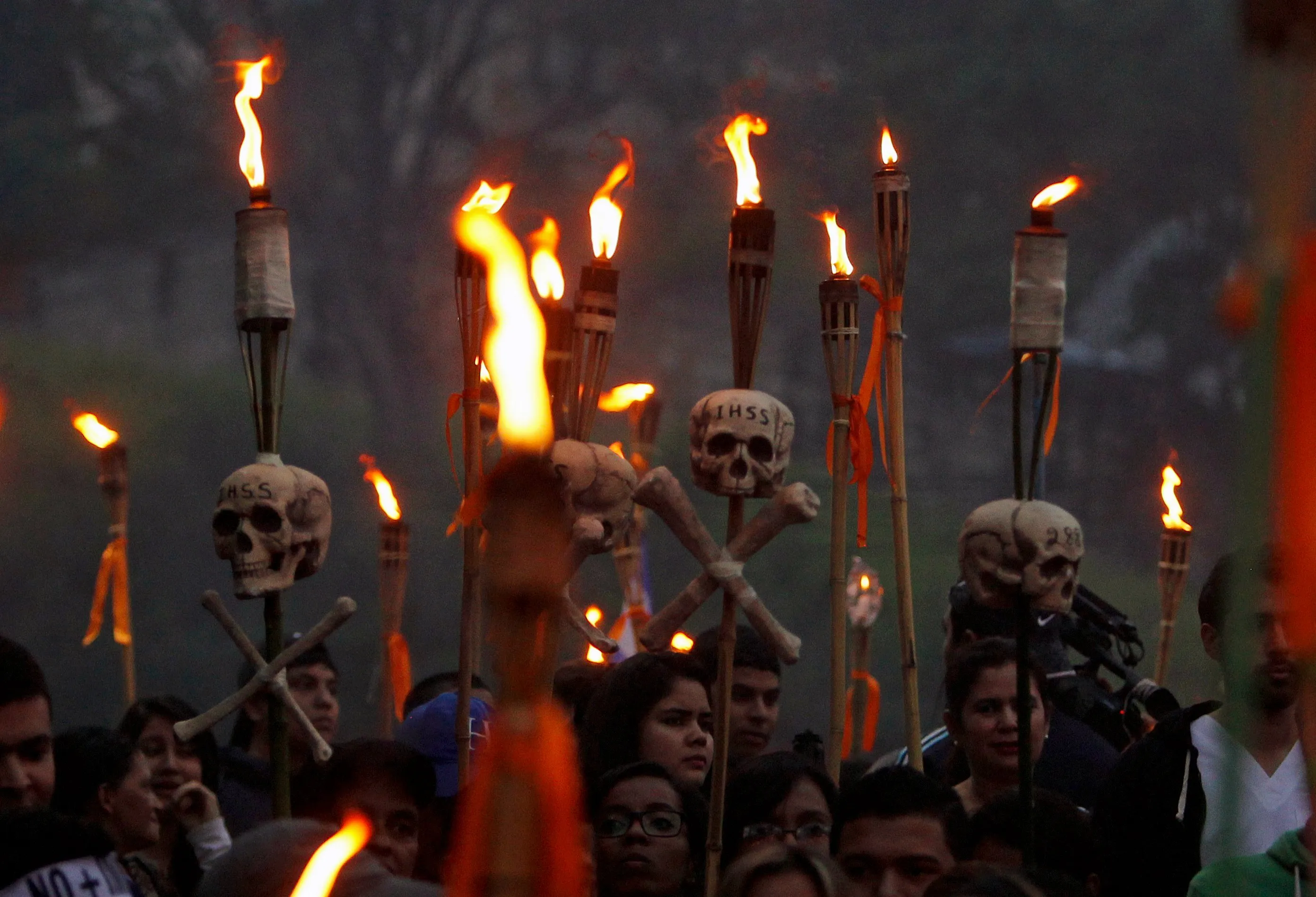 Demonstrators hold torches with skulls, inscribed with the acronym of the Honduran Institute of Social Security (IHSS), during a march to demand the resignation of Honduras' President Juan Orlando Hernandez in Tegucigalpa, July 10, 2015. (Photo by Jorge Cabrera/Reuters)