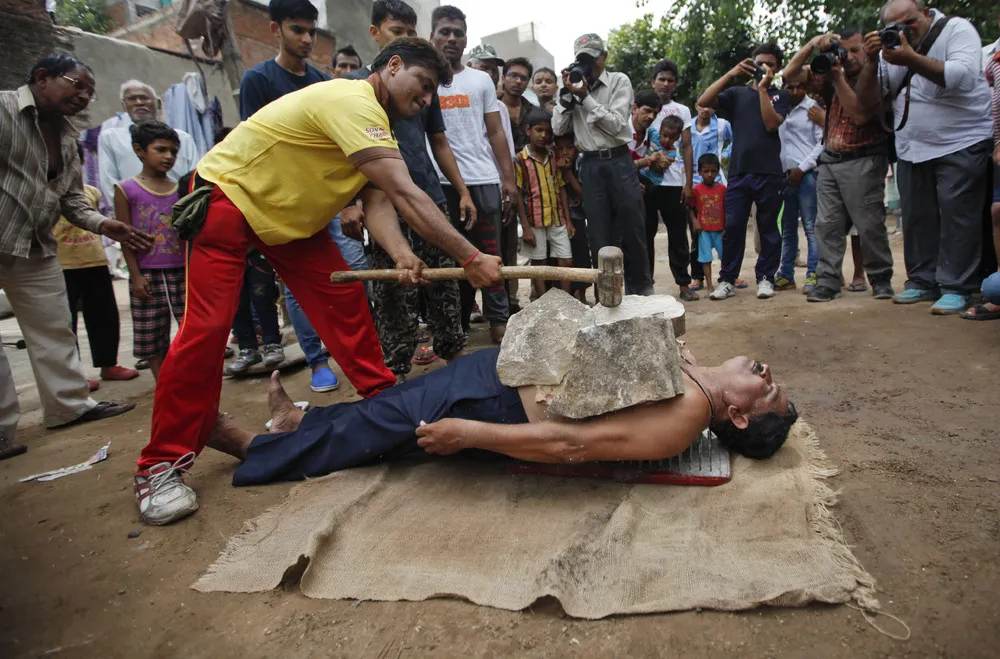 Residents gather to watch as Indian stuntmen display their skills before media in Ahmadabad, India, Sunday, July 12, 2015. The stuntmen are practicing to perform during the annual chariot procession of Hindu Lord Jagannath scheduled to be held on on July 18. (Photo by Ajit Solanki/AP Photo)