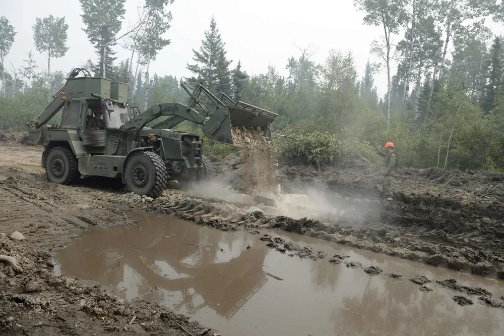 Corporal Dustin Zsovak, 1 Combat Engineer Regiment guides Corporal Willis Johnson who operates a multi-purpose engineering vehicle to clear a road near La Ronge, Saskatchewan July 10, 2015 in a picture released by the Canadian Armed Forces. The Canadian military has been called in to help fight wildfires in the Western province of Saskatchewan, where over 100 active fires have forced the evacuation of more than 13,000 people and threatened several remote towns. (Photo by MCpl Melanie Ferguson/Reuters/Canadian Forces)