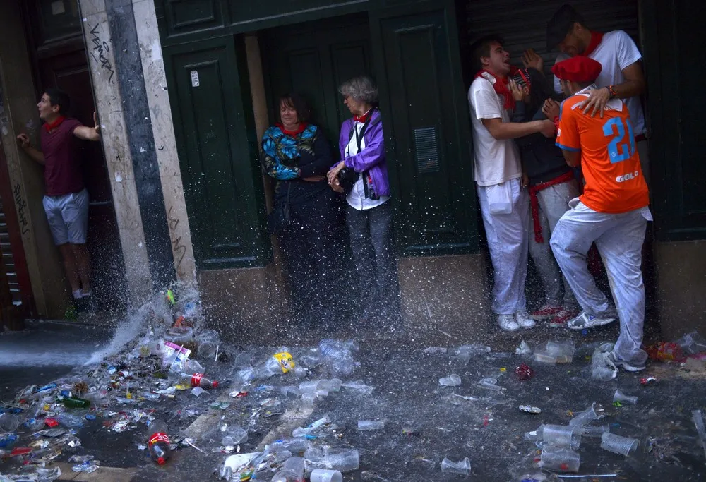 Revellers squeeze into doorways to avoid water jets from street cleaners on the seventh day of the San Fermin festival in Pamplona, northern Spain, July 12, 2015. (Photo by Vincent West/Reuters)