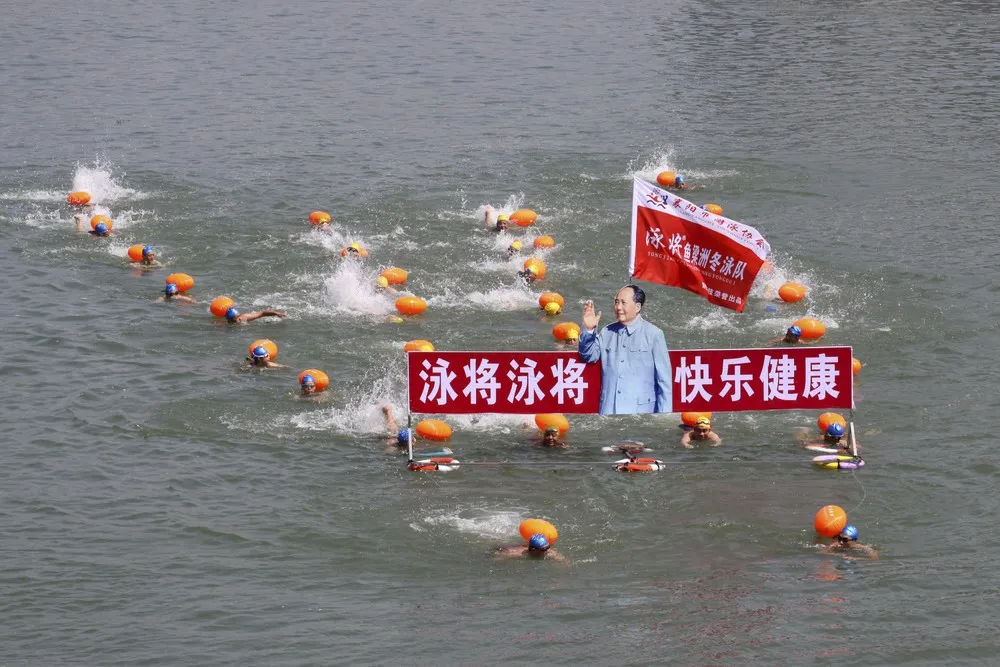 Participants swim with a portrait of late Chinese Chairman Mao Zedong in the Hanjiang River, a large branch of the Yangtze River in Xiangyang, Hubei province July 12, 2015. Hundreds of residents took part in the event to celebrate the upcoming 49th anniversary of Mao swimming in the Yangtze River on July 16, 1966, local media reported. The words beside the portrait read, “Swimming champions, be happy and healthy”. (Photo by Reuters/Stringer)