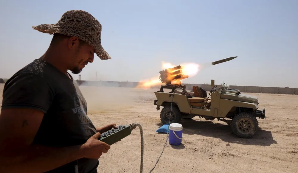 Members of Iraq's Shi'ite paramilitaries launch a rocket toward Islamic State militants outskirt the city of Falluja in province of Anbar, Iraq July 12, 2015. (Photo by Reuters/Stringer)