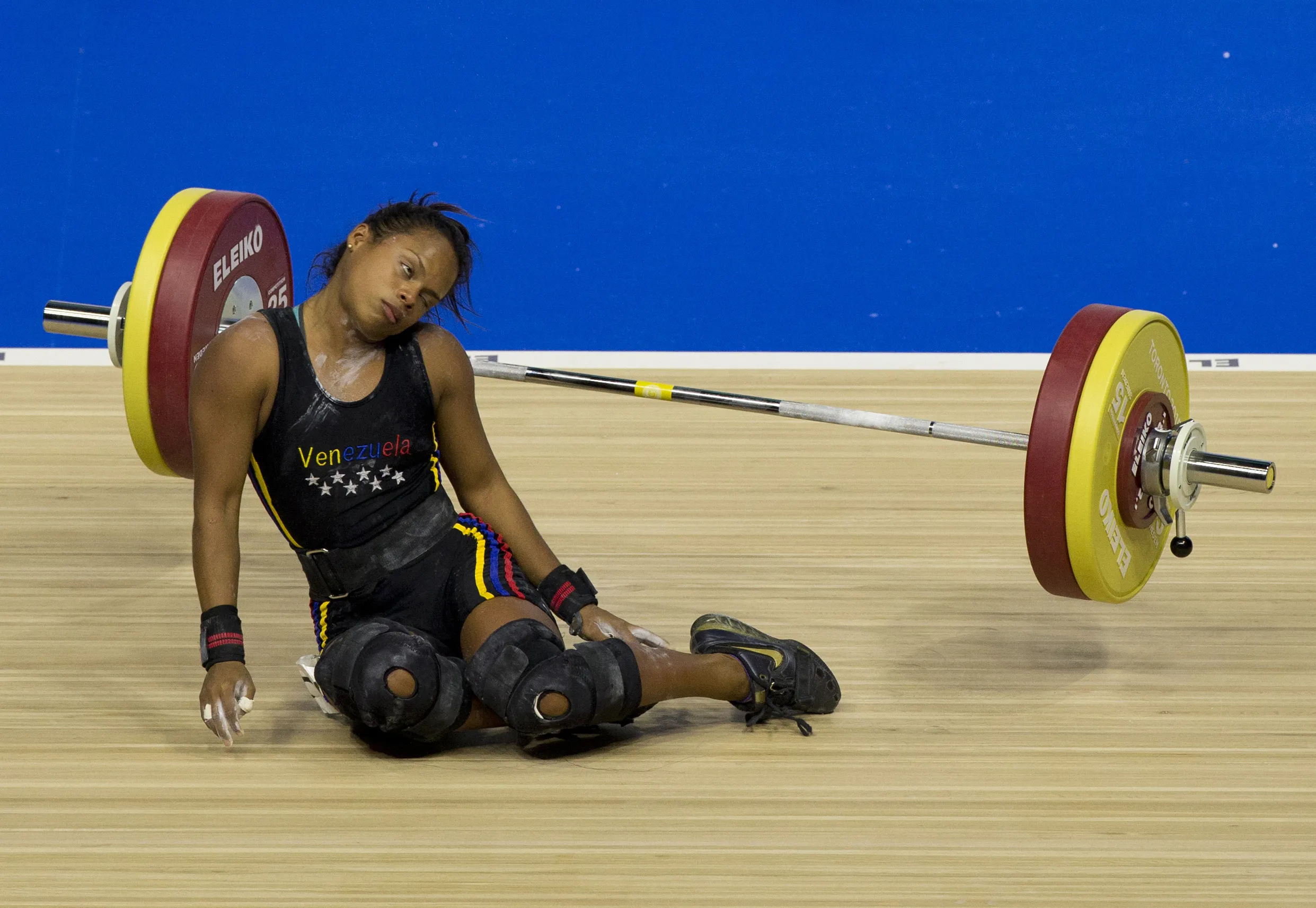 Venezuela's Genesis Rodriguez Gomez collapses during a lift attempt in the women's 53kg weightlifting at the Pan Am Games in Oshawa, Ontario, Sunday, July 12, 2015. Rodriguez took silver in the event. (Photo by Rebecca Blackwell/AP Photo)