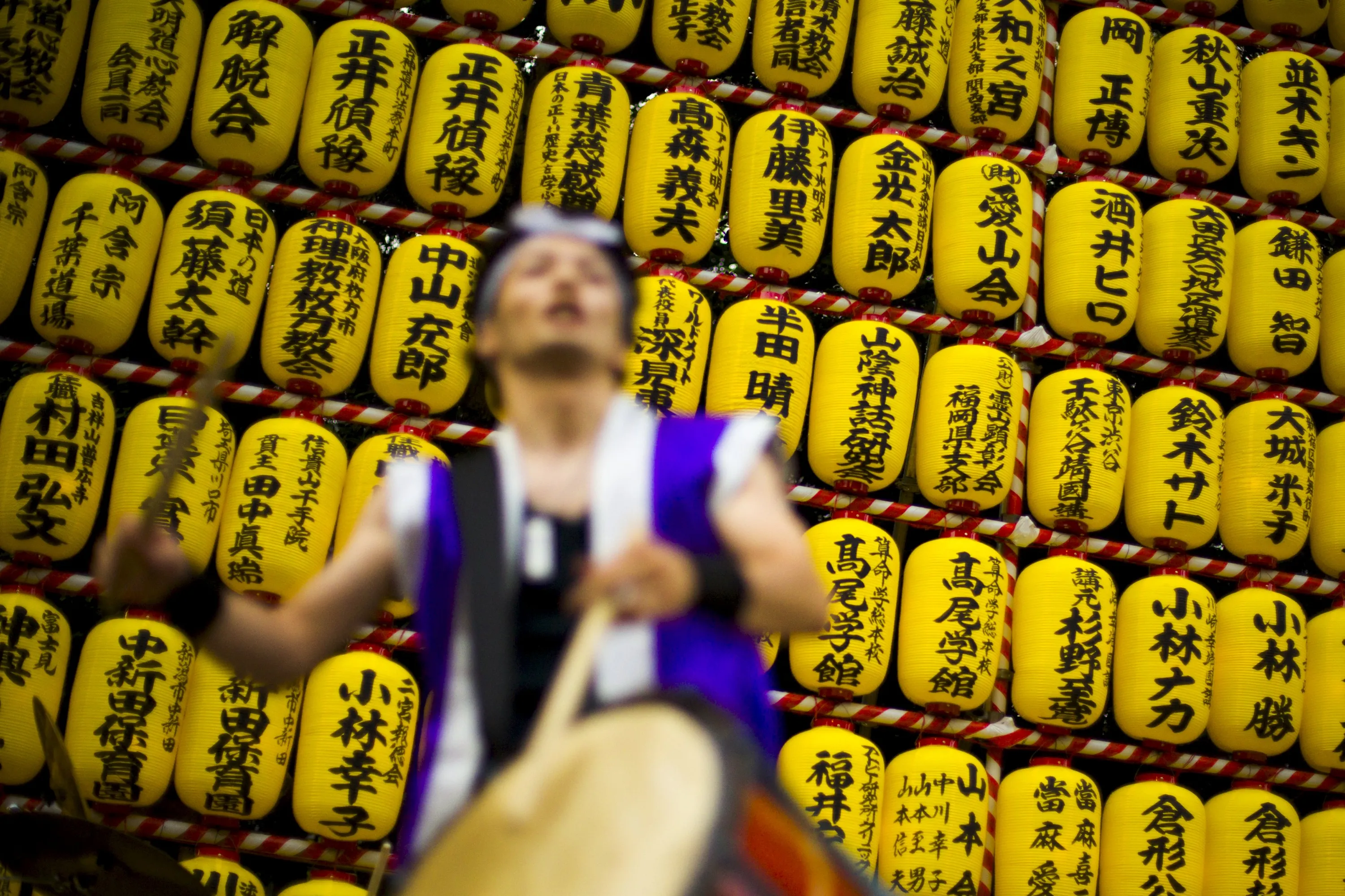 A man beats a drum in front of a wall of lanterns during the annual Mitama Festival at the Yasukuni Shrine in Tokyo, Japan, July 13, 2015. Over 30,000 lanterns light up the precincts of the shrine, where more than 2.4 million war dead are enshrined, during the four-day festival from July 13 to 16. (Photo by Thomas Peter/Reuters)