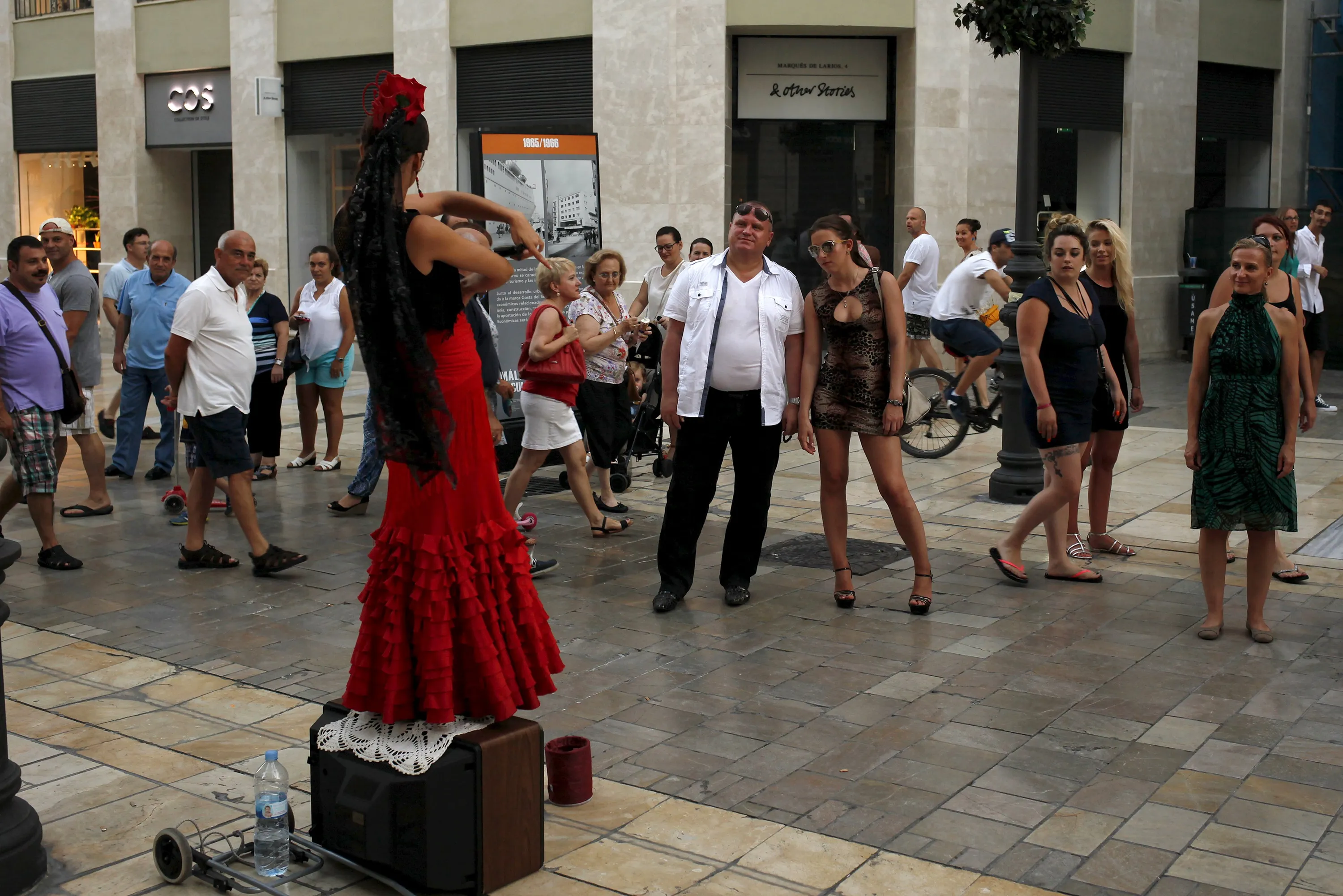 Tourists watch as a woman, wearing a traditional Sevillana dress, performs at Marques de Larios street in downtown Malaga, on Costa del Sol, southern Spain, July 12, 2015. The Spanish government raised the terror-alert level to 4, out of a maximum of 5, after the attacks in France, Tunisia and Kuwait, Spain's Interior Minister Jorge Fernandez Diaz announced on June 26. (Photo by Jon Nazca/Reuters)
