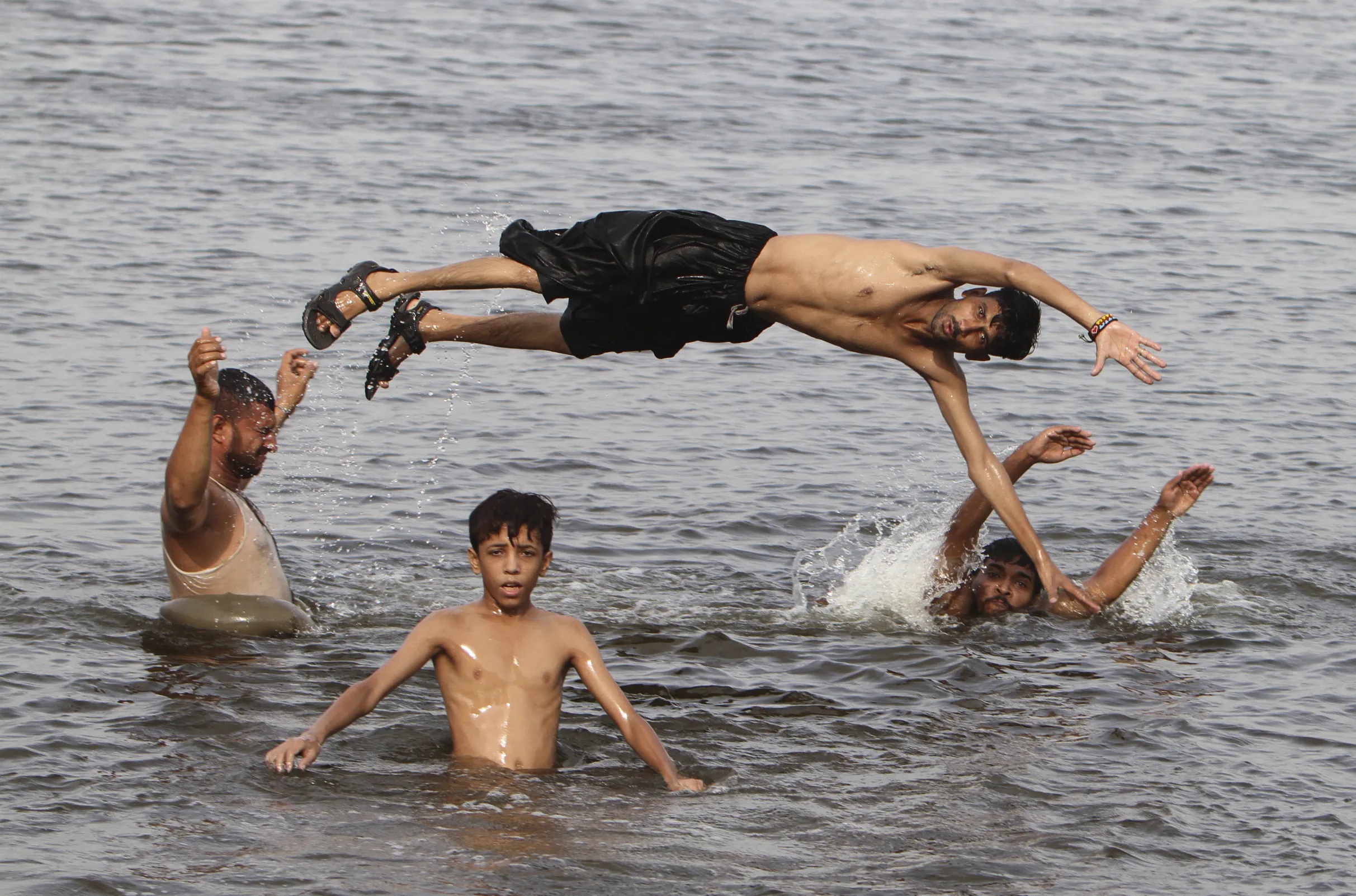 People cool themselves off in a water during a hot weather in Karachi, Pakistan, Wednesday, July 1, 2015. More than 1,200 people lost their lives due to a weeklong heat wave in the southern port city of Karachi, suffering from heatstroke and dehydration. (Photo by Fareed Khan/AP Photo)