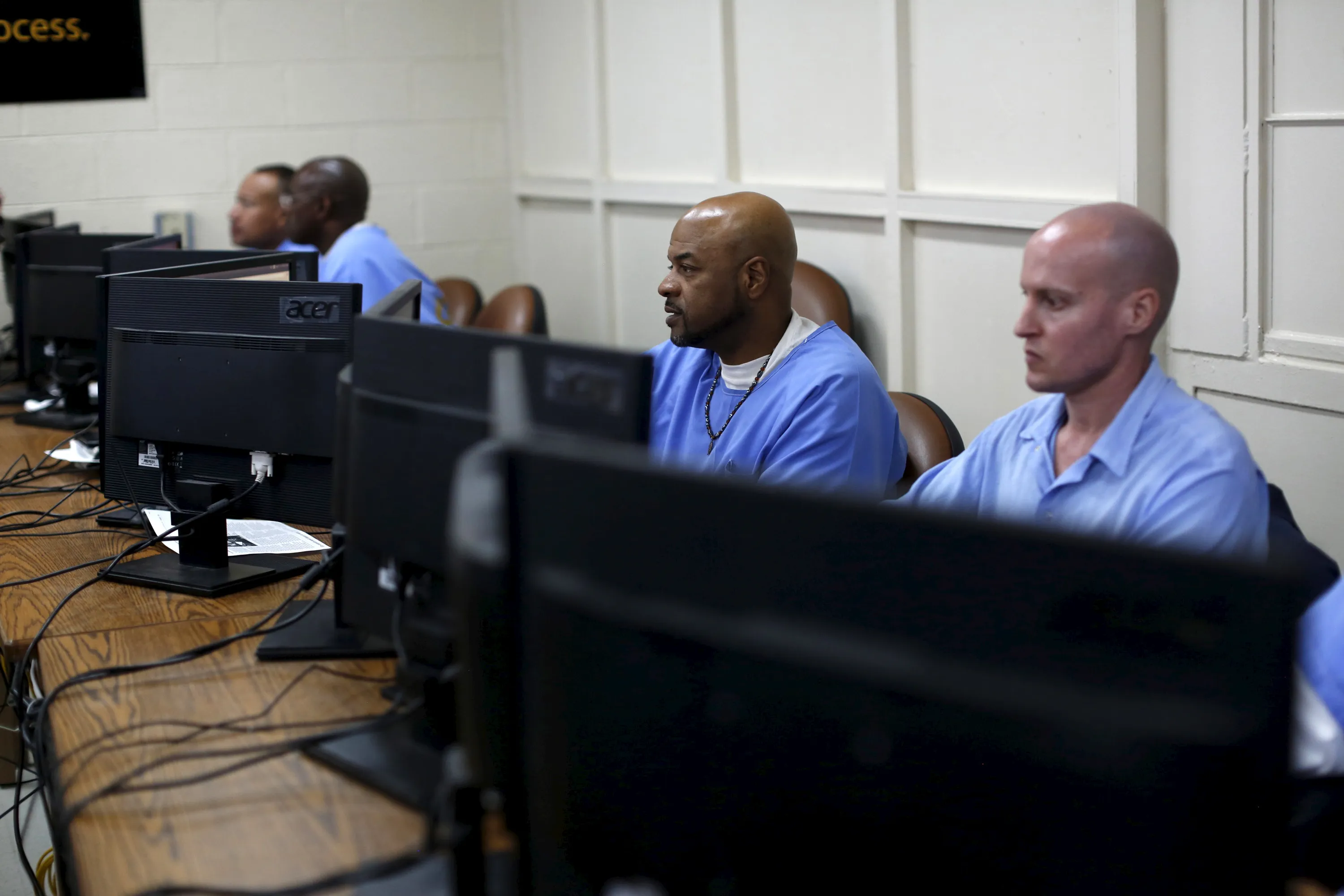Prisoners work at computers following a graduation ceremony from a computer coding program at San Quentin State Prison in San Quentin, California April 20, 2015. (Photo by Robert Galbraith/Reuters)