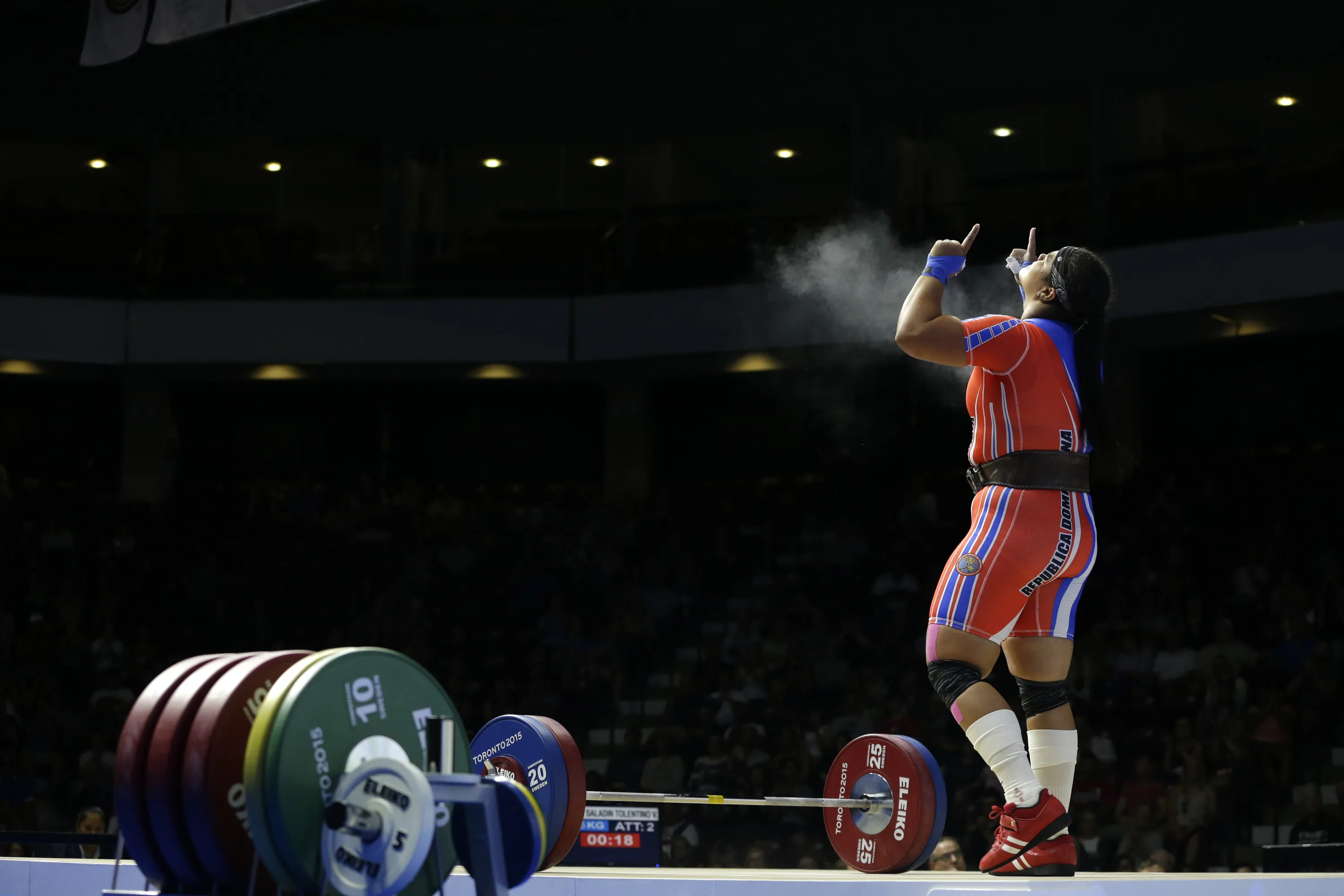 Dominican Republic's Veronica Saladin Tolentino celebrates after a successful lift attempt during the women's +75kg weightlifting competition at the Pan Am Games in Oshawa, Ontario, Wednesday, July 15, 2015. (Photo by Felipe Dana/AP Photo)