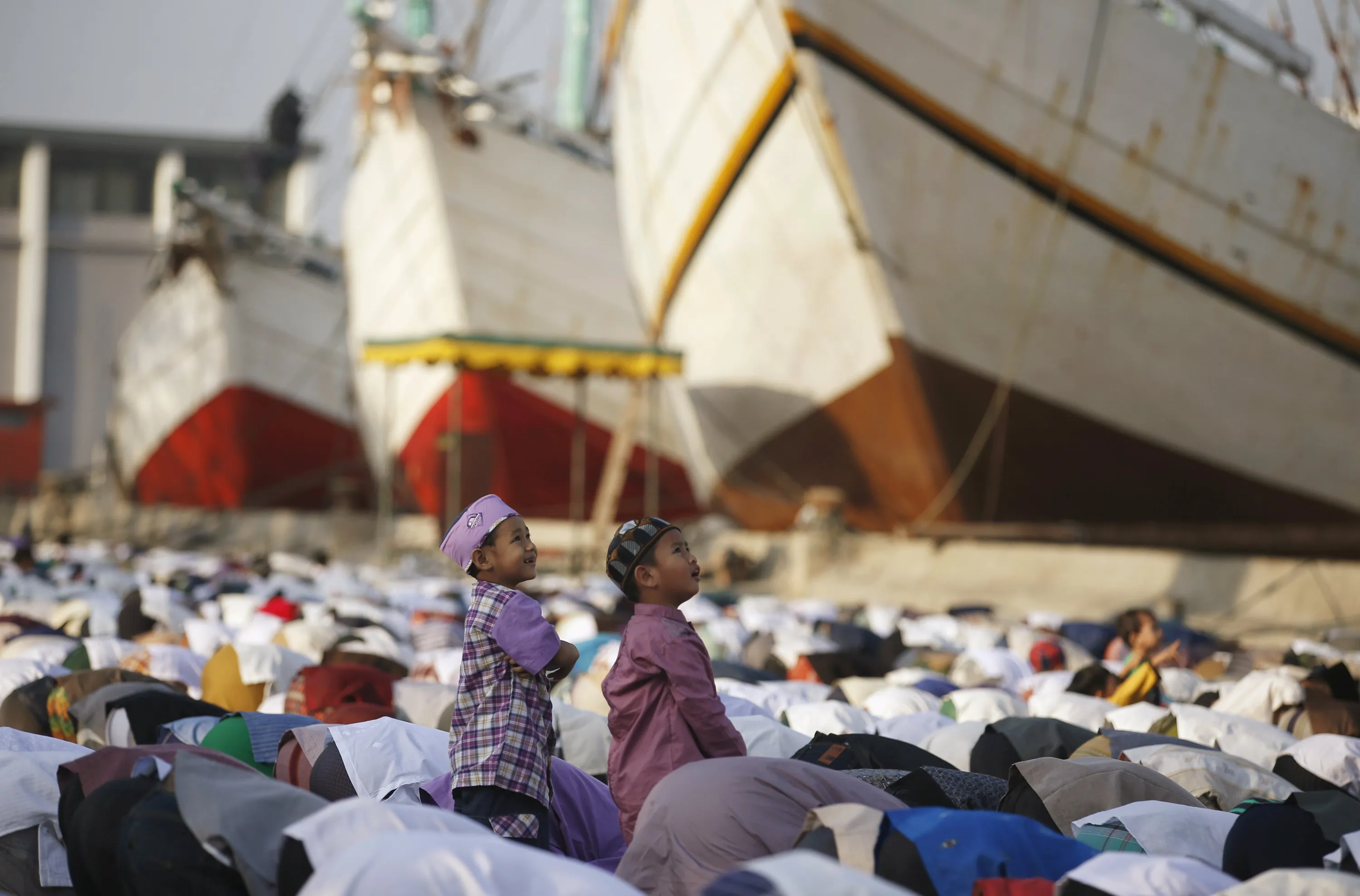 Muslims pray next to traditional Indonesian Phinisi ships on Eid al-Fitr at Sunda Kelapa port in Jakarta, Indonesia July 17, 2015. Indonesia, which has the world's largest Muslim population, celebrates Eid al-Fitr with mass prayers and family visits to mark the end of the holy fasting month of Ramadan. (Photo by Darren Whiteside/Reuters)