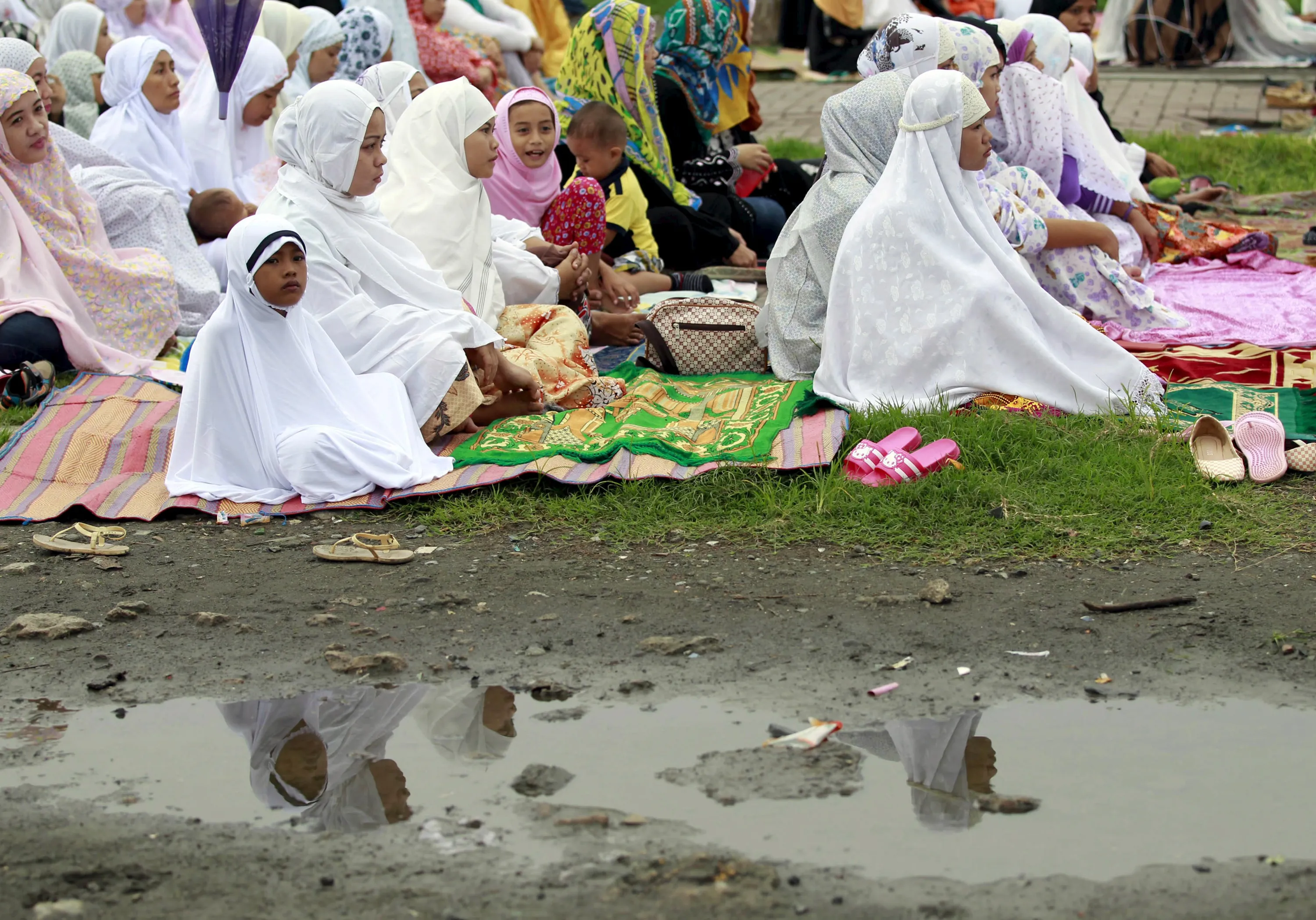 Muslim women and children are reflected on a puddle as they await the start of their morning prayer at a park in a slum area in Tondo, metro Manila July 17, 2015. (Photo by Romeo Ranoco/Reuters)