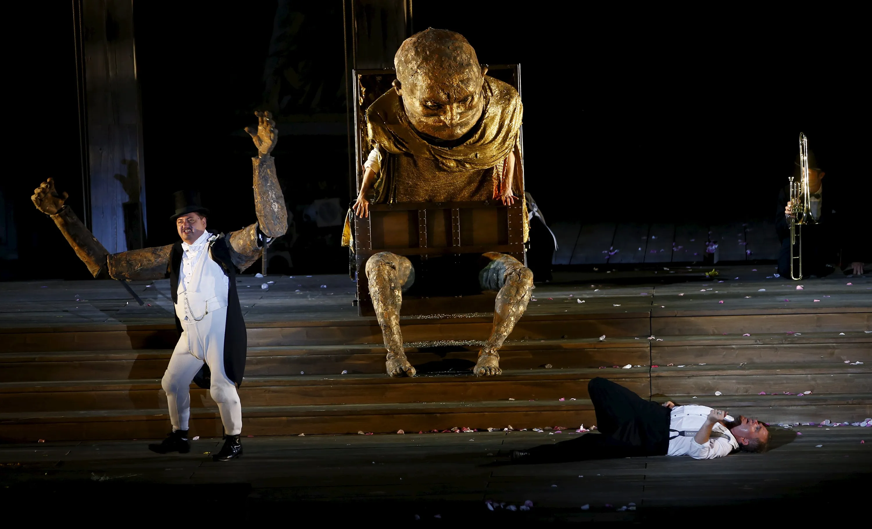 Actors Cornelius Obonya as Jedermann and Juergen Tarrach (L) as Mammon perform on stage during a dress rehearsal of Hugo von Hofmannsthal's drama “Jedermann” (Everyman) at Domplatz square in Salzburg, Austria, July 16, 2015. (Photo by Leonhard Foeger/Reuters)
