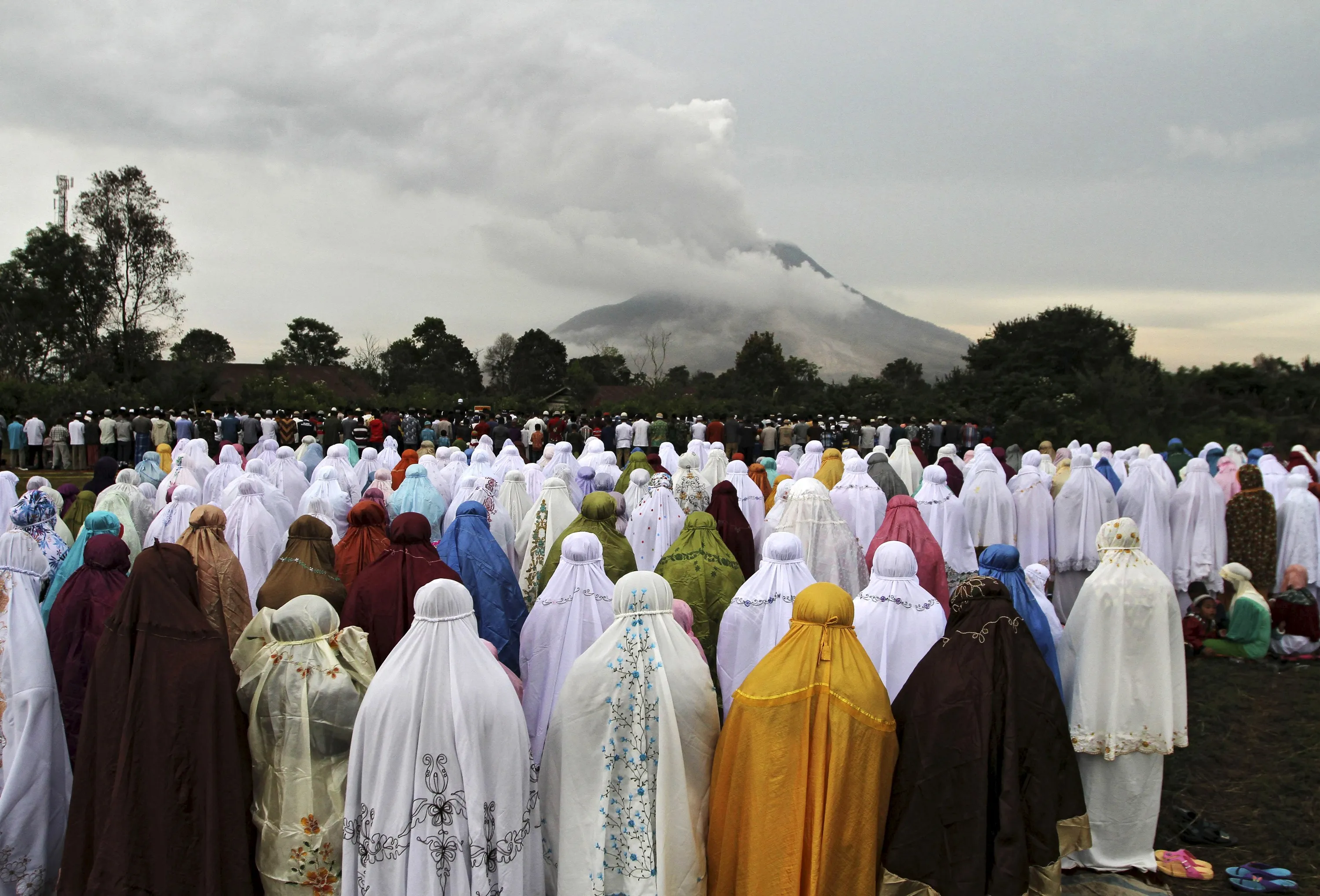 Displaced Muslims living near the active volcano Mount Sinabung take part in an Eid al-Fitr prayer near the volcano at Ndokum Siroga village in Karo, North Sumatra Indonesia, July 17, 2015. Indonesia, which has the world's largest Muslim population, celebrates Eid al-Fitr with mass prayers and family visits to mark the end of the holy fasting month of Ramadan. (Photo by Y. T Haryono/Reuters)