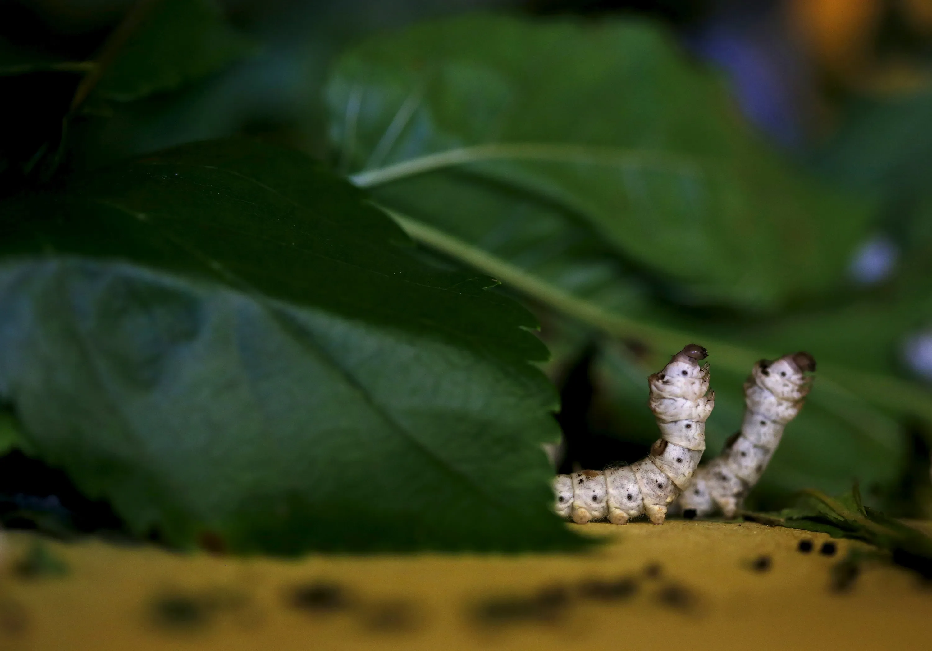 Two late-developing silkworms are seen as they munch on piles of locally-grown mulberry at the CRA agricultural research unit in Padua, Italy, June 4, 2015. (Photo by Alessandro Bianchi/Reuters)
