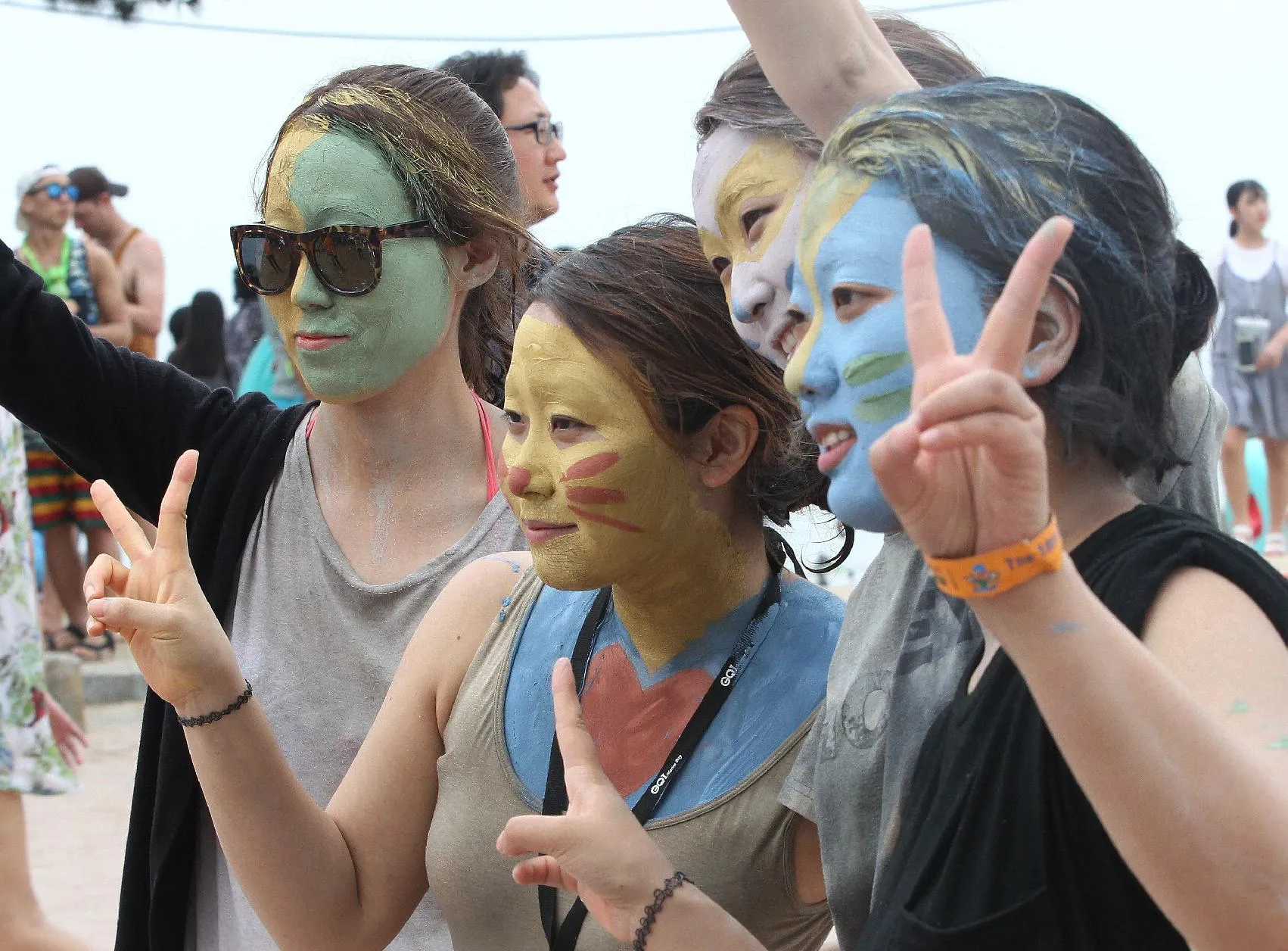 Women wear colored mud on their faces during the Boryeong Mud Festival at Daecheon Beach in Boryeong, South Korea, Saturday, July 18, 2015. The 18th annual mud festival features mud wrestling and mud sliding.(Photo by Ahn Young-joon/AP Photo)