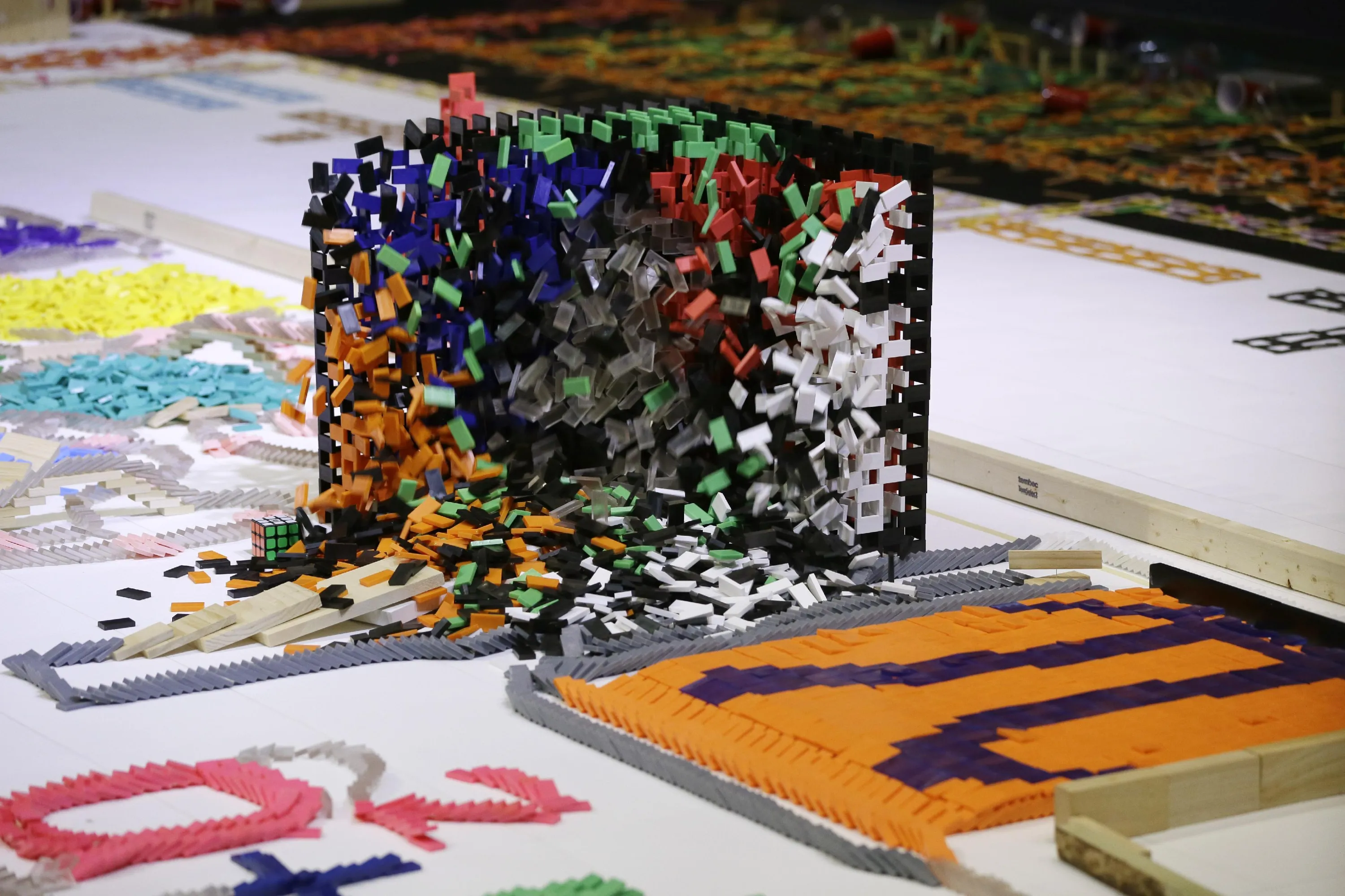 A building on a chain reaction machine collapses during activation at the Michigan Science Center, Saturday, July 18, 2015 in Detroit. (Photo by Carlos Osorio/AP Photo)