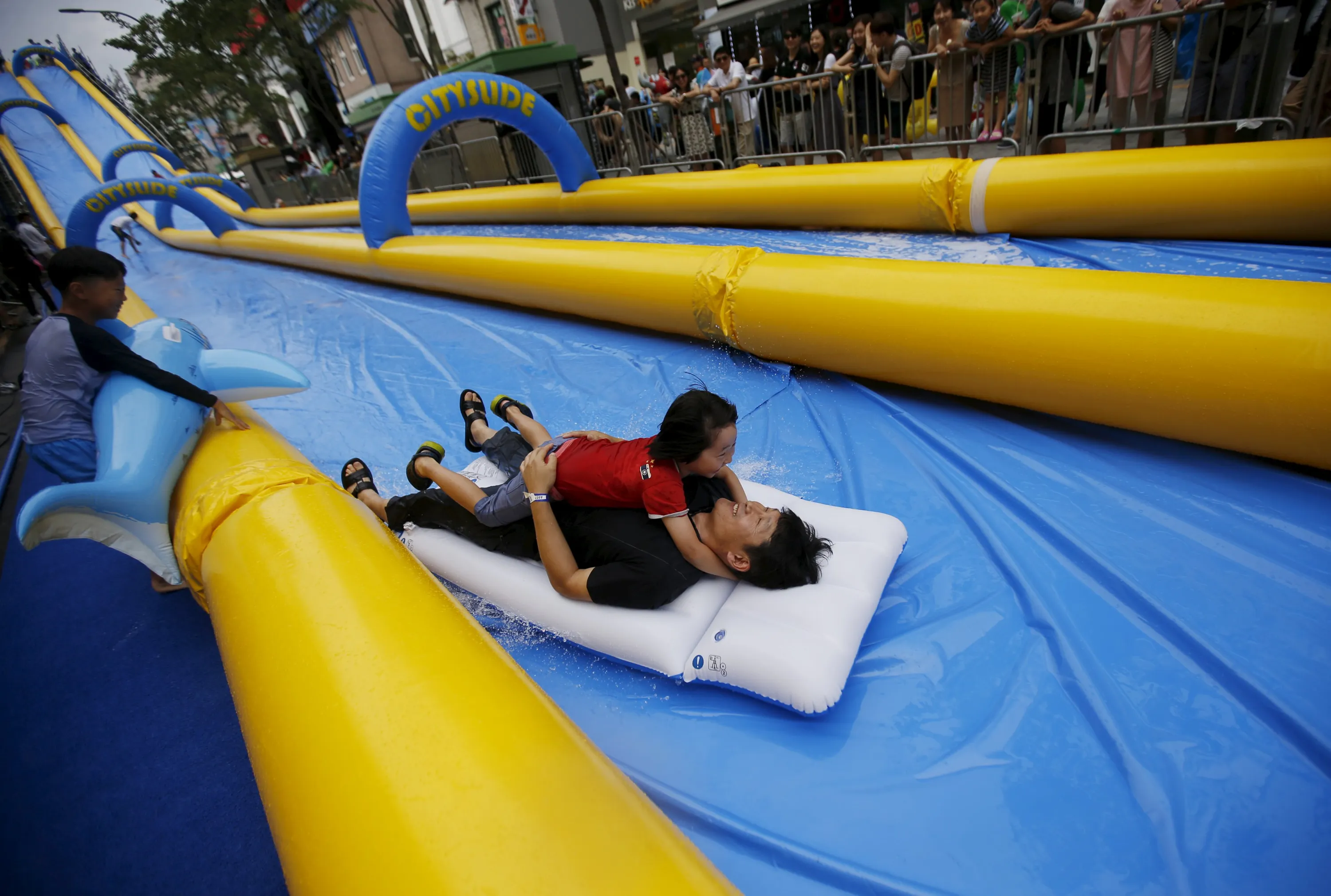 A man holding his daughter enjoys a ride on a 350-meter (1148 feet) long water slide during 2015 City Silde Festa in central Seoul, South Korea, July 19, 2015. (Photo by Kim Hong-Ji/Reuters)