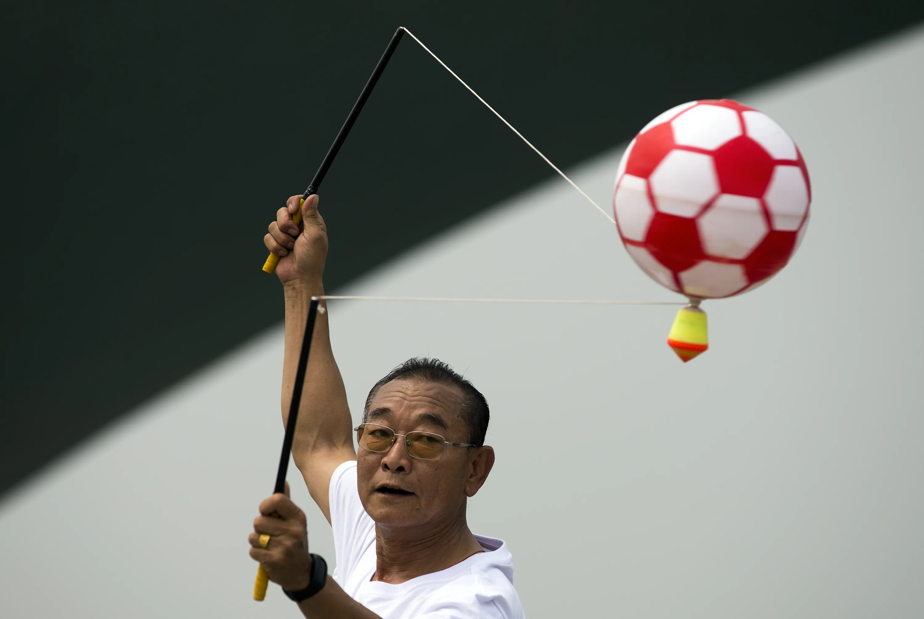 In this Sunday, June 28, 2015 photo, a man spins a top mount with an inflatable ball during a public sport campaign to promote exercise at Garden Expo Park in Beijing. (Photo by Andy Wong/AP Photo)