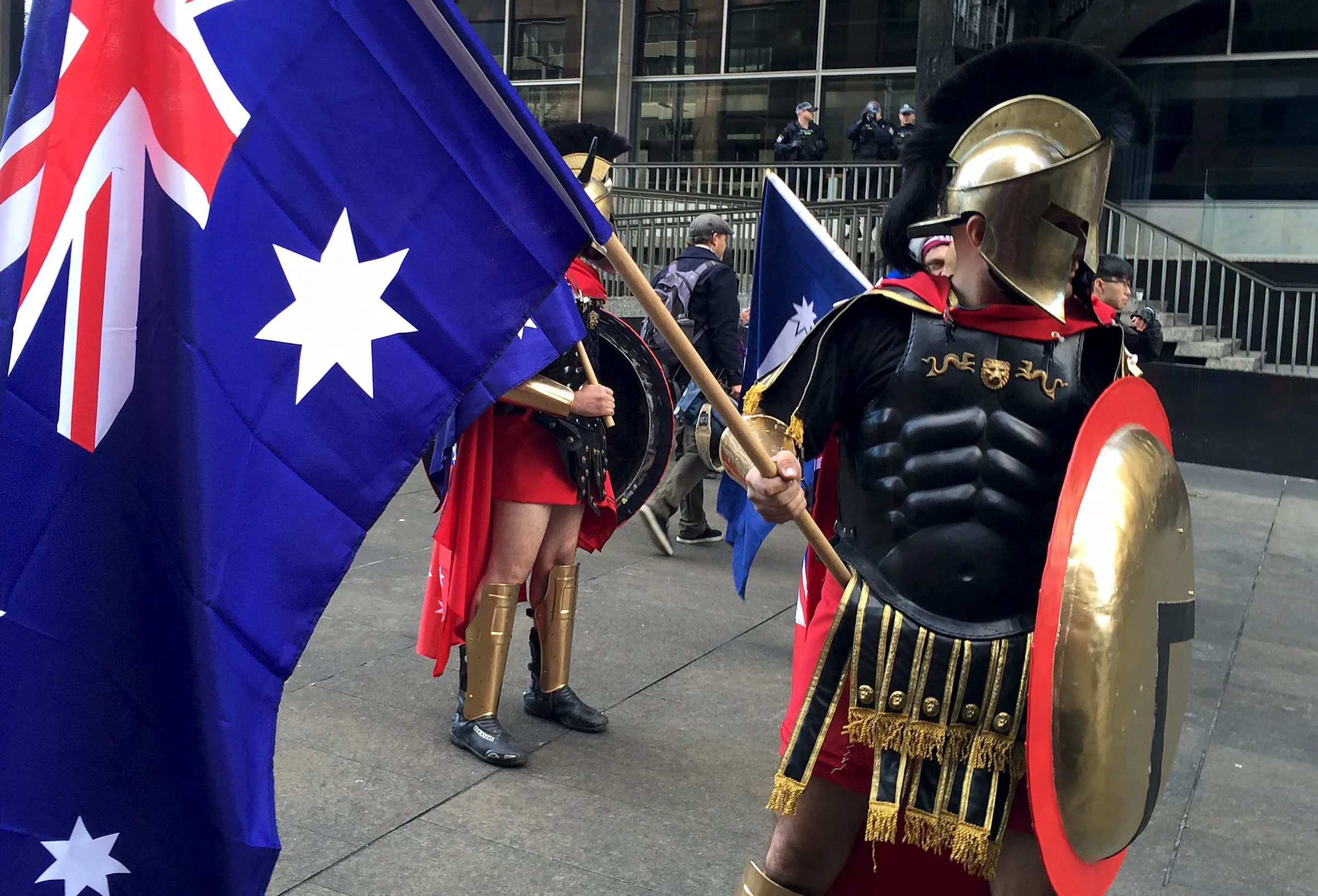 Protesters dressed in costume and carrying Australian flags attend a “Reclaim Australia” protest in central Sydney, Australia, July 19, 2015. Anti-racist and nationalist protesters held demonstrations in several Australian cities and towns on Sunday, with the two sides being seperated by police, local media reported. (Photo by Baris Atayman/Reuters)