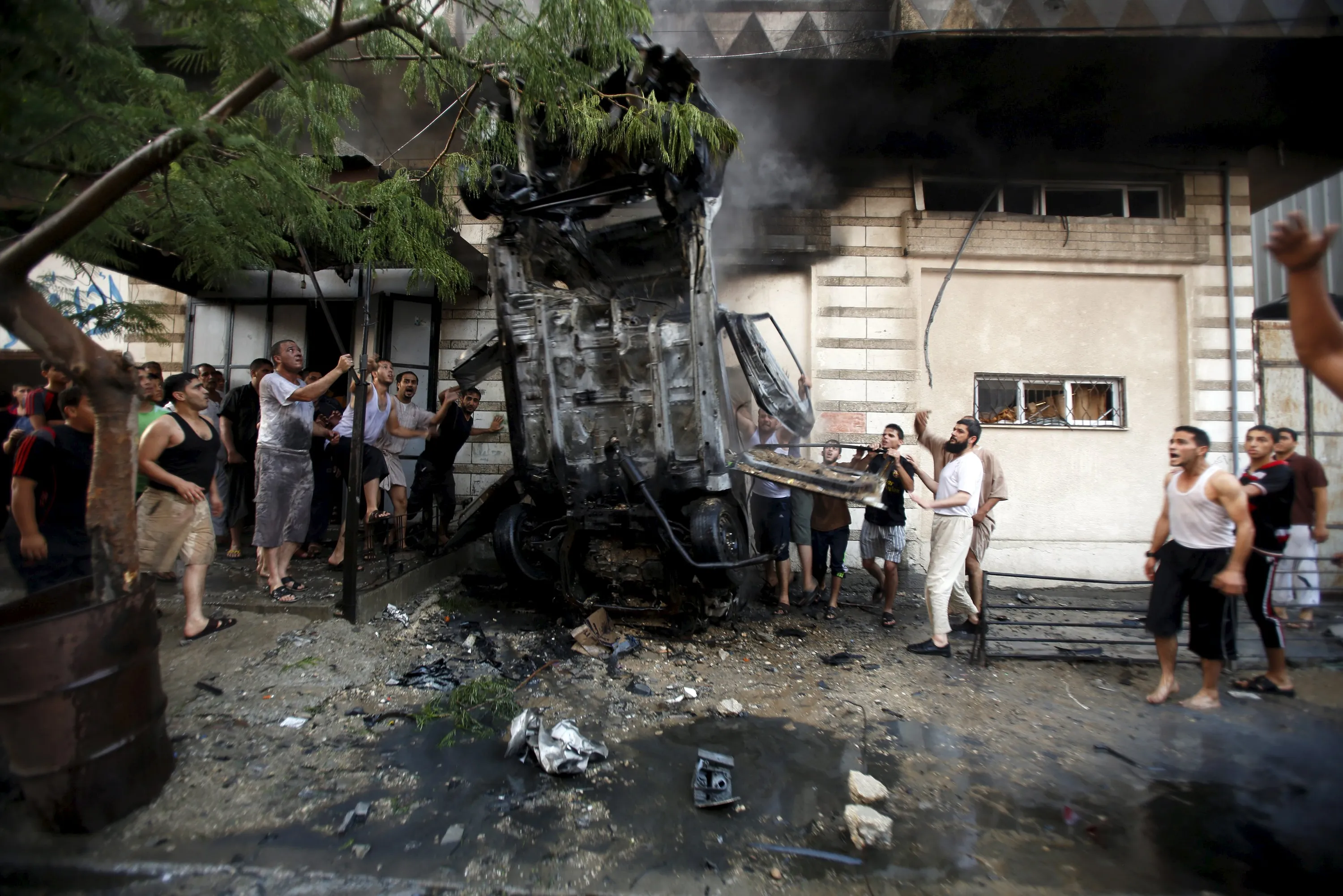 Palestinians inspect a car after it was blown up in Gaza City July 19, 2015. The spokesman for Gaza's interior ministry said that a number of cars belonging to Palestinian factions were blown up by vandals and the security services started to investigate the incident. (Photo by Suhaib Salem/Reuters)