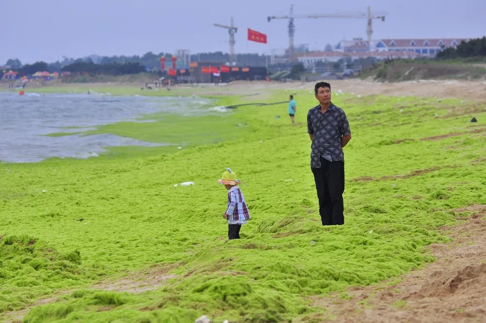 A man looks away as a child plays on a algae-covered beach in Rizhao, Shandong province, China, July 18, 2015. (Photo by Reuters/Stringer)
