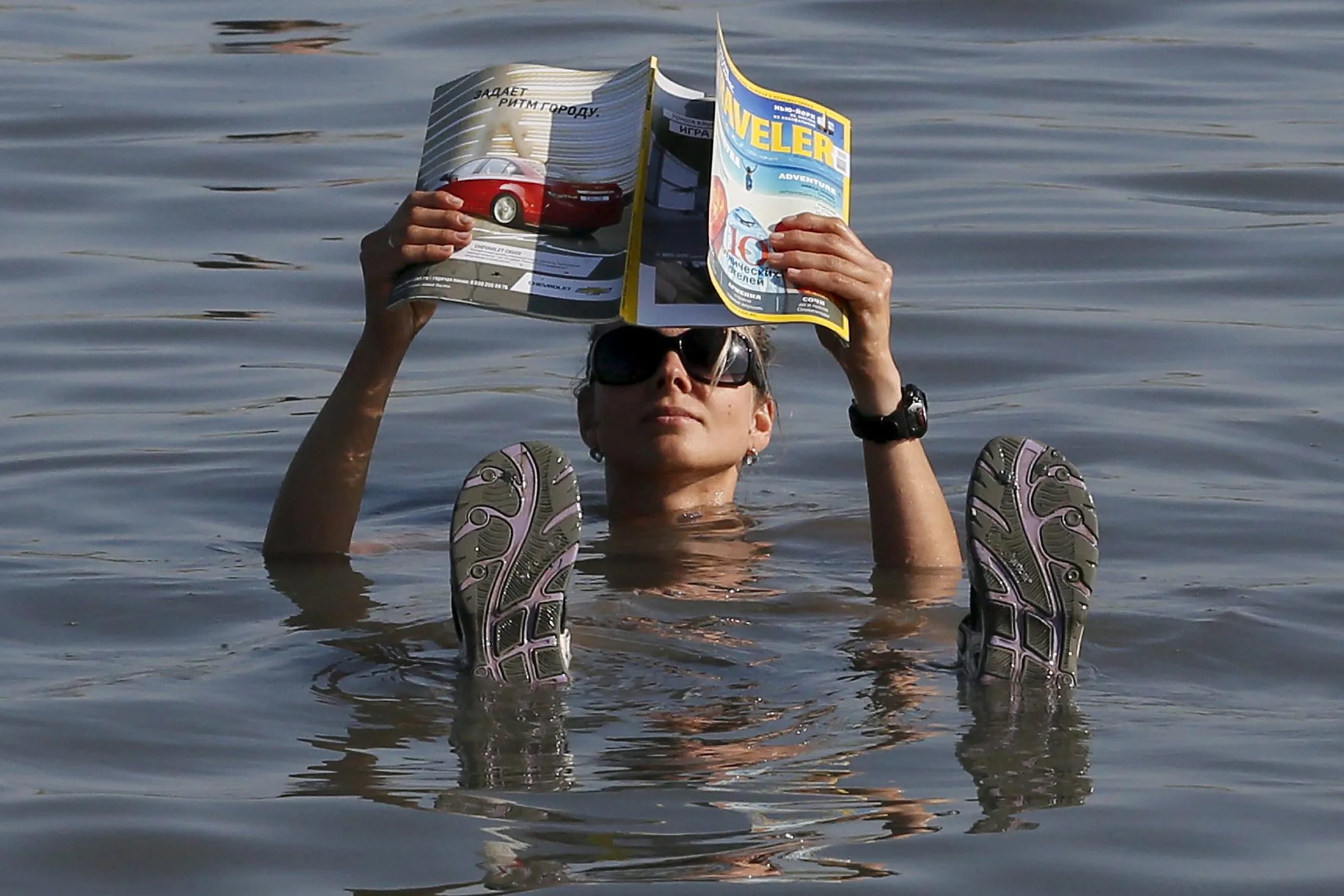 A woman reads a magazine as she floats in the salt waters of Tus lake in Khakassia region, southwest of the Siberian city of Krasnoyarsk, Russia, July 18, 2015. (Photo by Ilya Naymushin/Reuters)
