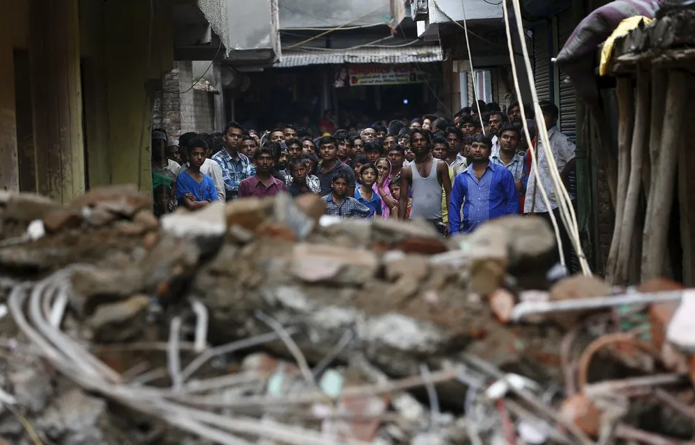 Onlookers stand at the site of a collapsed building in New Delhi, India, July 19, 2015. (Photo by Adnan Abidi/Reuters)