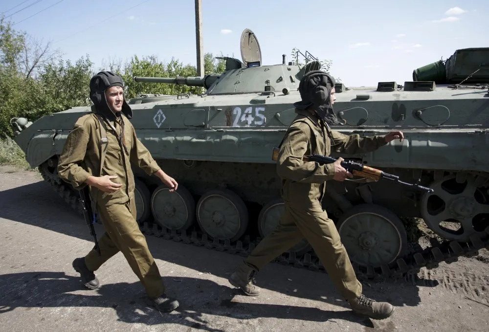 Members of the self-proclaimed Donetsk People's Republic forces walk past an armoured personnel carrier (APC) outside the village of Novolaspa in Donetsk region, Ukraine, July 19, 2015. The Donetsk People's Republic (DNR) and Lugansk People's Republic (LNR) announced a unilateral withdrawal of smaller weapons under 100mm calibre from the front line, according to local media. (Photo by Alexander Ermochenko/Reuters)