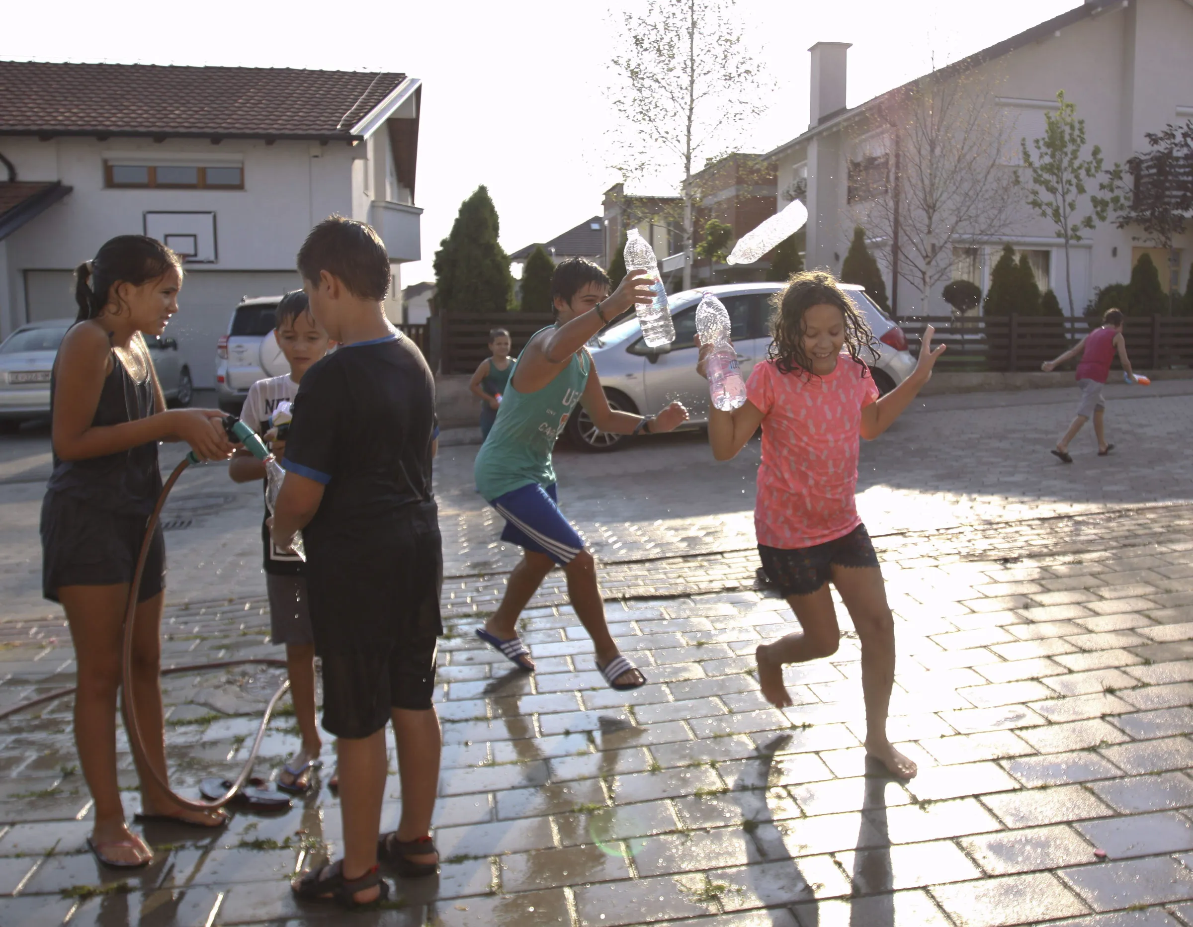 Kids throw water at each other as they try to refresh themselves on a hot day in Hajvali 15 km (12 miles) from capital Pristina on Sunday, July 19, 2015. Europe's heat wave has pushed the mercury to levels as high as 40 degrees Celsius, 104 fahrenheit. (Photo by Visar Kryeziu/AP Photo)