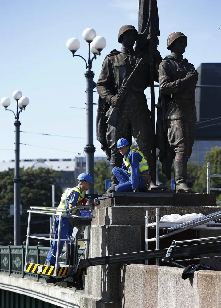 Workers prepare to dismantle Soviet era statues from the Green Bridge over the Neris river in Vilnius, Lithuania, Sunday July 19, 2015. Statues depicting Red Army soldiers, workers, students and peasants were erected on the historic Green Bridge over the River Neris in 1952, 12 years after the Soviet Union occupied Lithuania and its Baltic neighbors, Latvia and Estonia. (Photo by Mindaugas Kulbis/AP Photo)