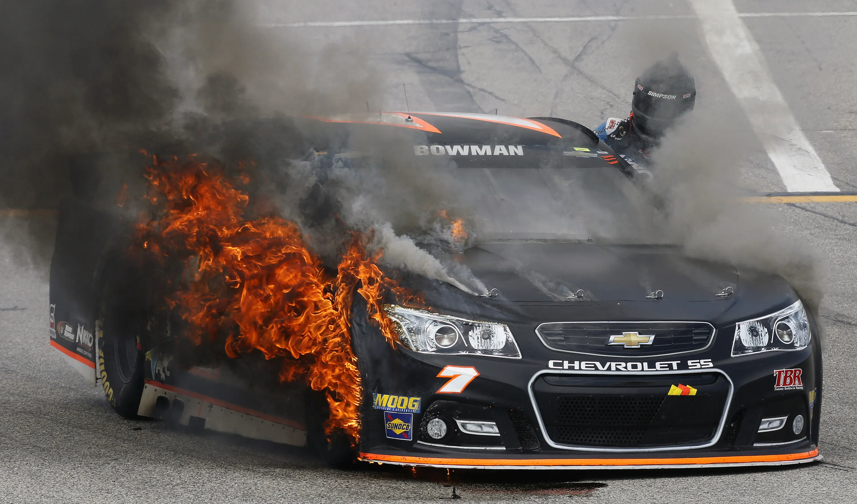 Alex Bowman climbs out of his burning car during the NASCAR Sprint Cup series auto race at New Hampshire Motor Speedway, Sunday, July 19, 2015, in Loudon, N.H. (Photo by Jim Cole/AP Photo)