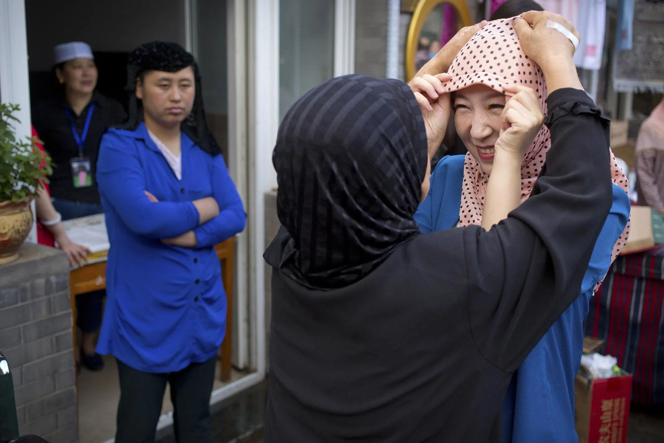A woman helps a Chinese Muslim woman adjust her headscarf before Eid al-Fitr prayers at the Niujie mosque, the oldest and largest mosque in Beijing, Saturday, July 18, 2015. The Eid al-Fitr celebrations mark the end of the Muslim holy fasting month of Ramadan. (Photo by Mark Schiefelbein/AP Photo)